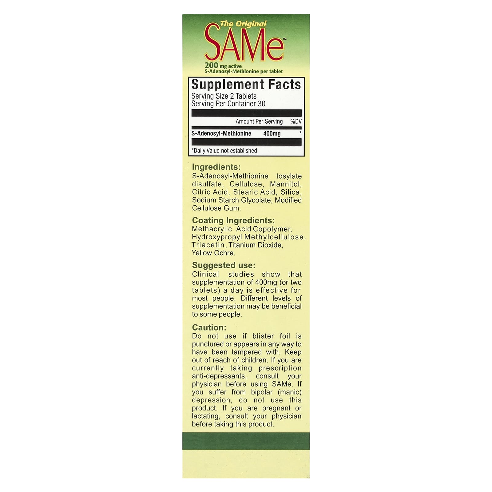 Не используйте, если блистерная фольга повреждена или есть сомнения в ее целостности. Хранить в недоступном для детей месте. Если вы принимаете прописанные вам антидепрессанты, проконсультируйтесь с врачом перед использованием SAMe. Не используйте продукт, если вы страдаете биполярной (маниакальной) депрессией. Если вы беременны или кормите грудью, перед применением добавки обратитесь за консультацией к врачу.