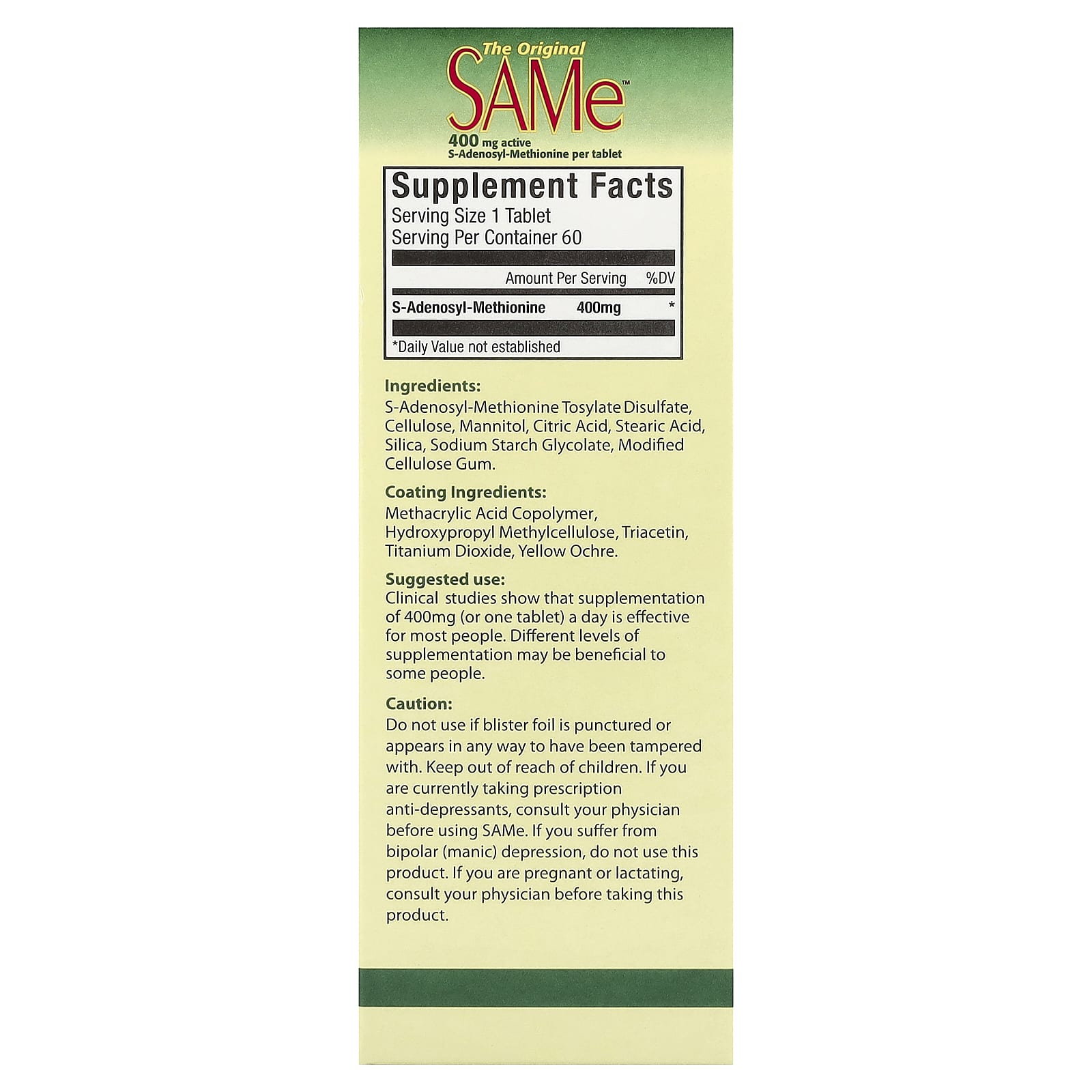 Не используйте, если блистерная фольга повреждена или есть сомнения в ее целостности. Хранить в недоступном для детей месте. Если вы принимаете прописанные вам антидепрессанты, проконсультируйтесь с врачом перед использованием SAMe. Не используйте продукт, если вы страдаете биполярной (маниакальной) депрессией. Если вы беременны или кормите грудью, перед применением добавки обратитесь за консультацией к врачу.