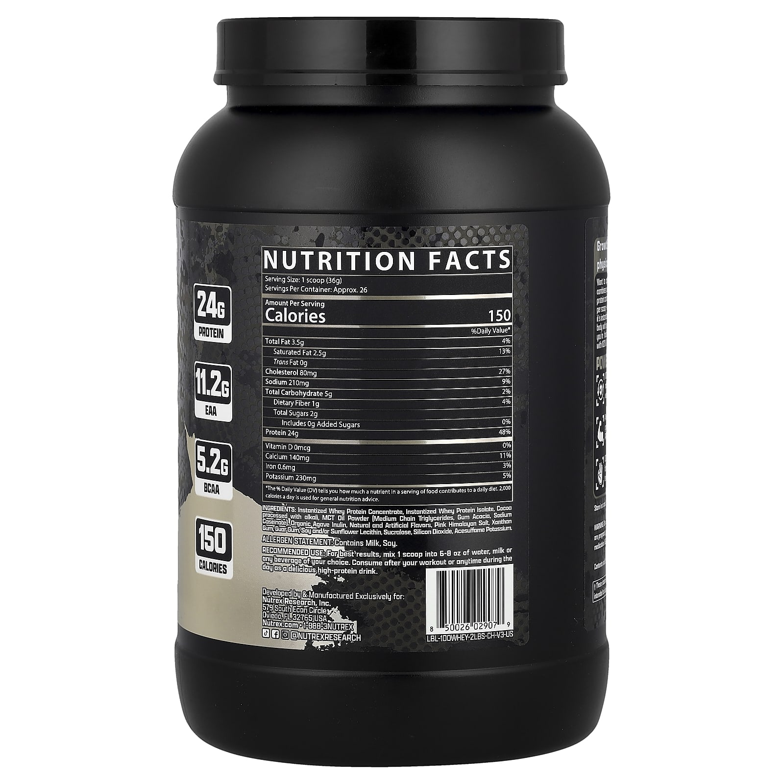 Растворимый концентрат сывороточного протеина, инстантизированный изолят сывороточного протеина, обработанное щелочью какао, масляный порошок mct (среднецепочечные триглицериды, аравийская камедь, казеинат натрия), органический инулин агавы, натуральные и искусственные ароматизаторы, розовая гималайская соль, ксантановая камедь, гуаровая камедь, кокаин и / или подсолнечный лецитин, сукралоза, диоксид кремния, ацесульфам калия.