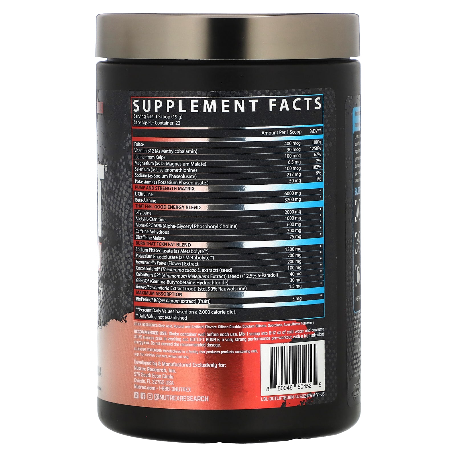 OUTLIFT Burn содержит 1500 мг Metabolyte™ — продукта, ускоряющего обмен веществ, а также усовершенствованную формулу, включающую самые передовые соединения для сжигания жира на рынке. OUTLIFT Burn содержит сжигающую жир матрицу, не имеющую себе равных среди всех предтренировочных комплексов.