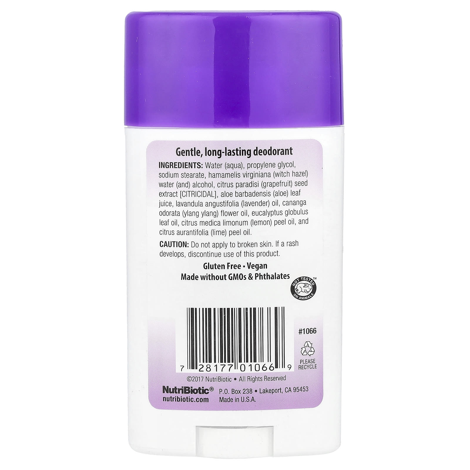 Дезодорант NutriBiotic® с лавандой — это нежный дезодорант длительного действия, содержащий экстракт гамамелиса, грейпфрутовых косточек, алоэ и эфирные масла.