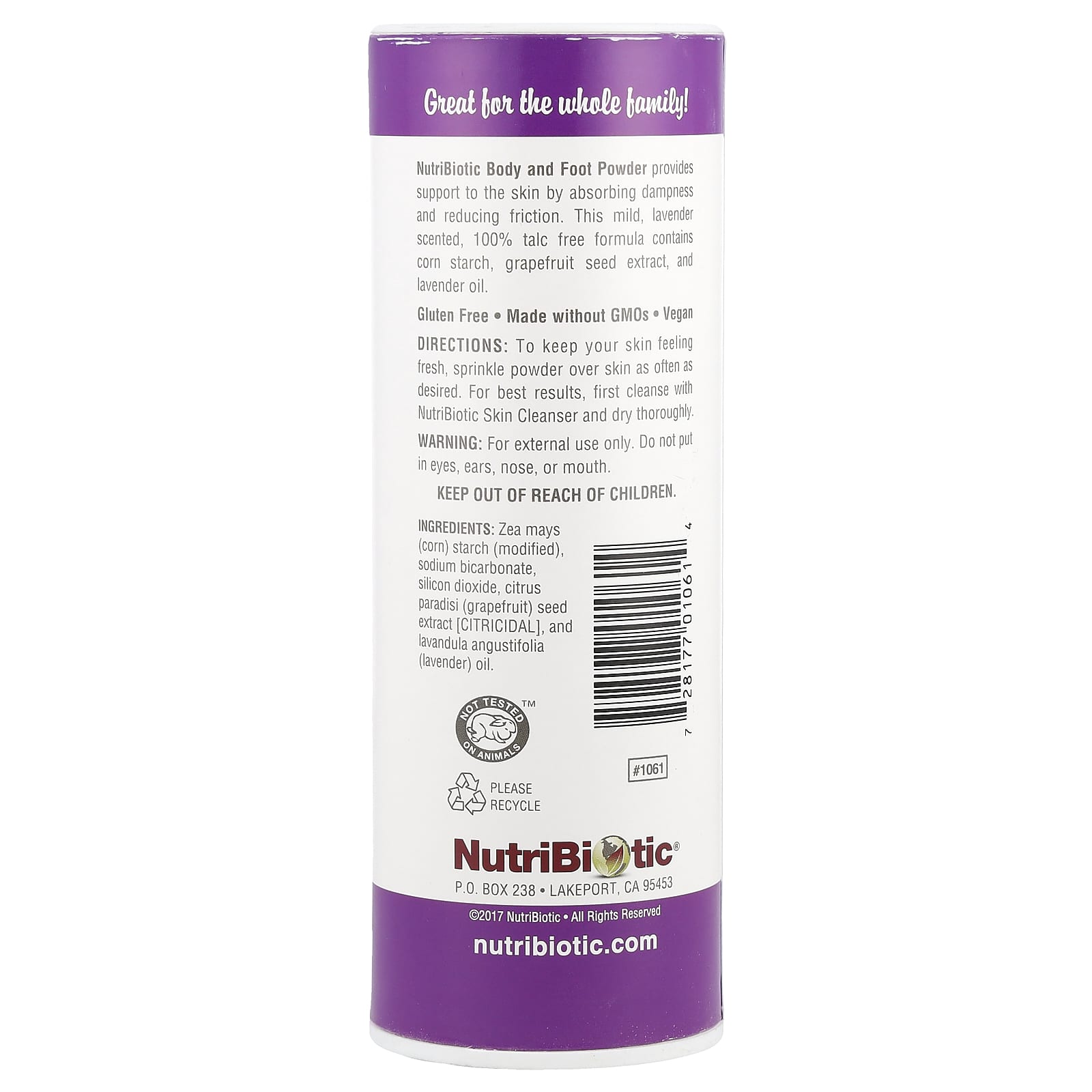 Пудра для тела и ног NutriBiotic поддерживает кожу, поглощая влагу и уменьшая трение. Это мягкое средство с ароматом лаванды, на 100% не содержащее талька, содержит кукурузный крахмал, экстракт семян грейпфрута и лавандовое масло.