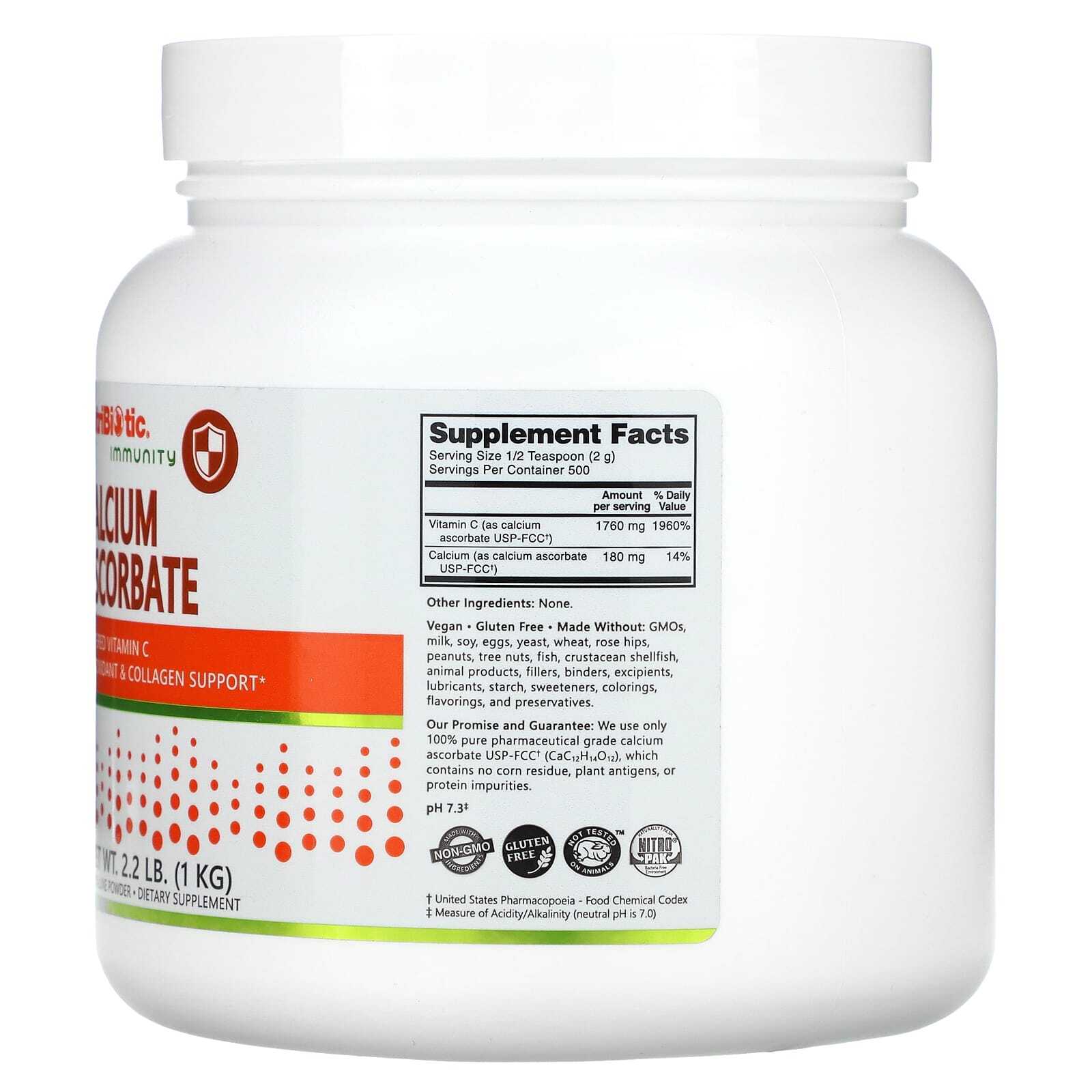 Аскорбат кальция NutriBiotic® — это полностью прореагировавший буферизованный кристаллический порошок, содержащий 100% витамин C (L-аскорбиновую кислоту) фармацевтической степени чистоты и кальций в хорошо растворимой форме.