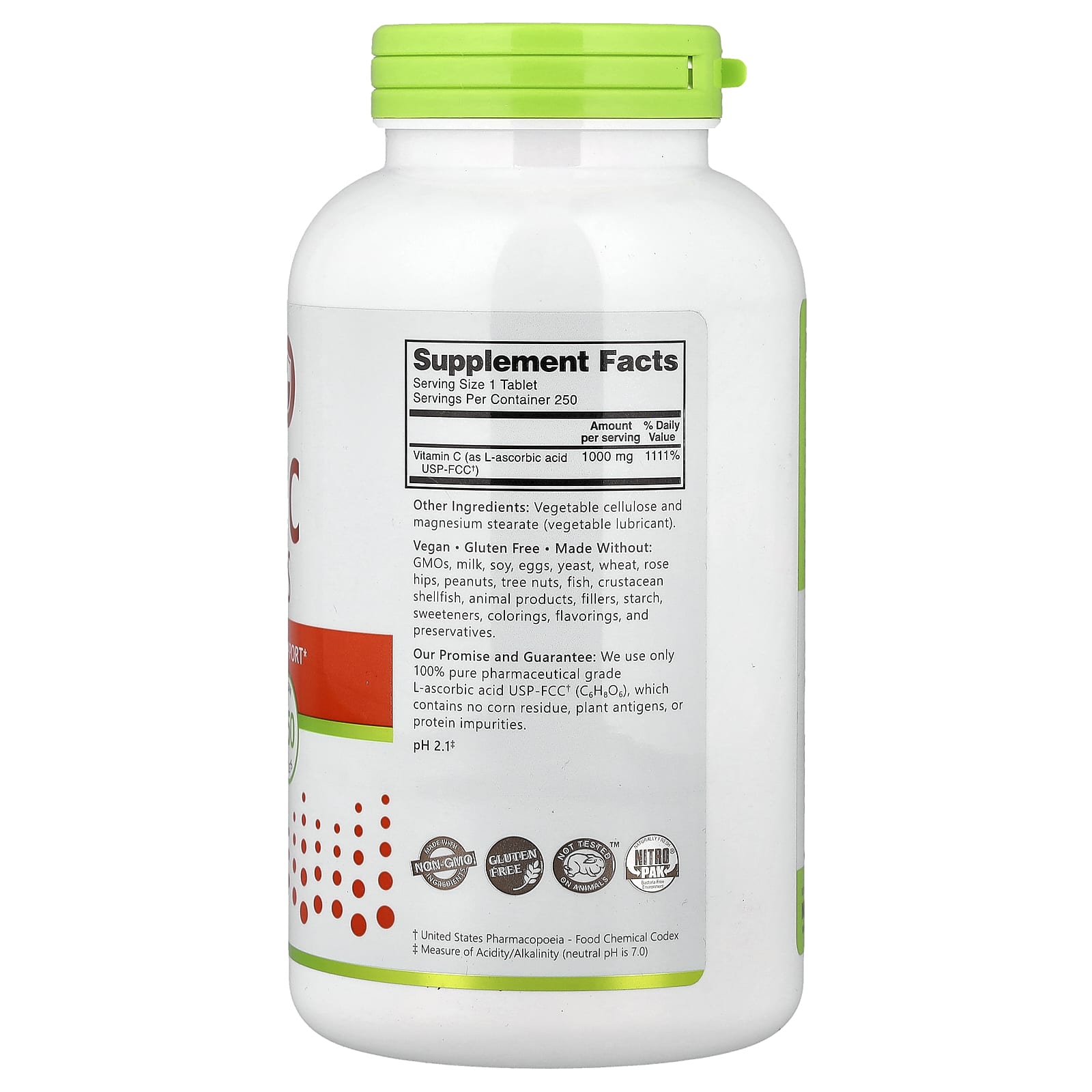 Наши обязательства и гарантия. Мы используем только на 100% чистую L-аскорбиновую кислоту фармацевтической степени чистоты USP-FCC† (C6H8O6), которая не содержит остатков кукурузы, антигенов растений, белковых примесей.