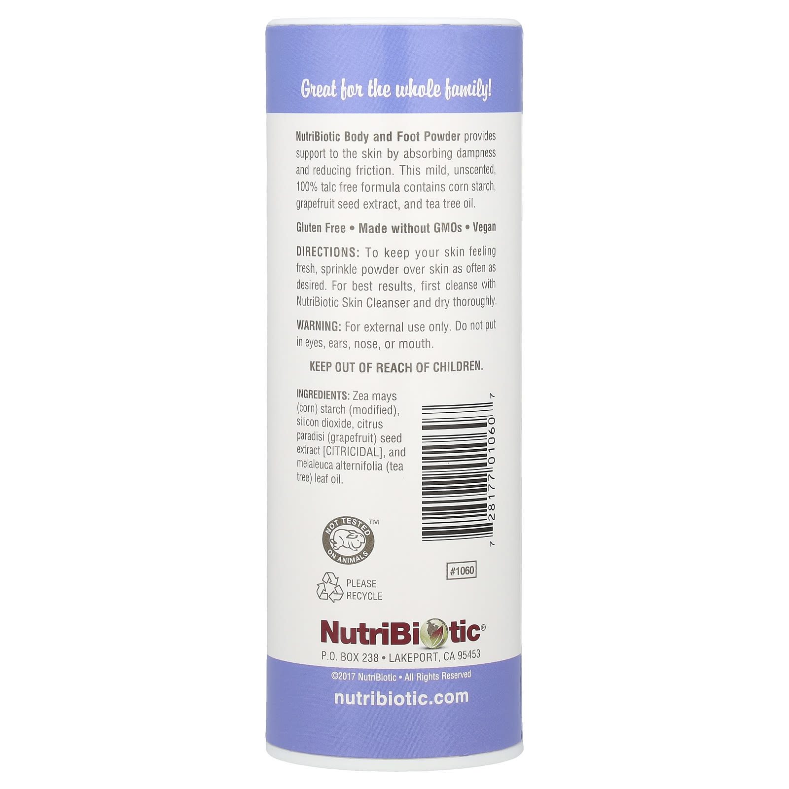 Пудра для тела и ног NutriBiotic поддерживает кожу, впитывая влагу и уменьшая трение. Это мягкое средство без запаха, на 100% не содержащее талька, содержит кукурузный крахмал, экстракт семян грейпфрута и масло чайного дерева.
