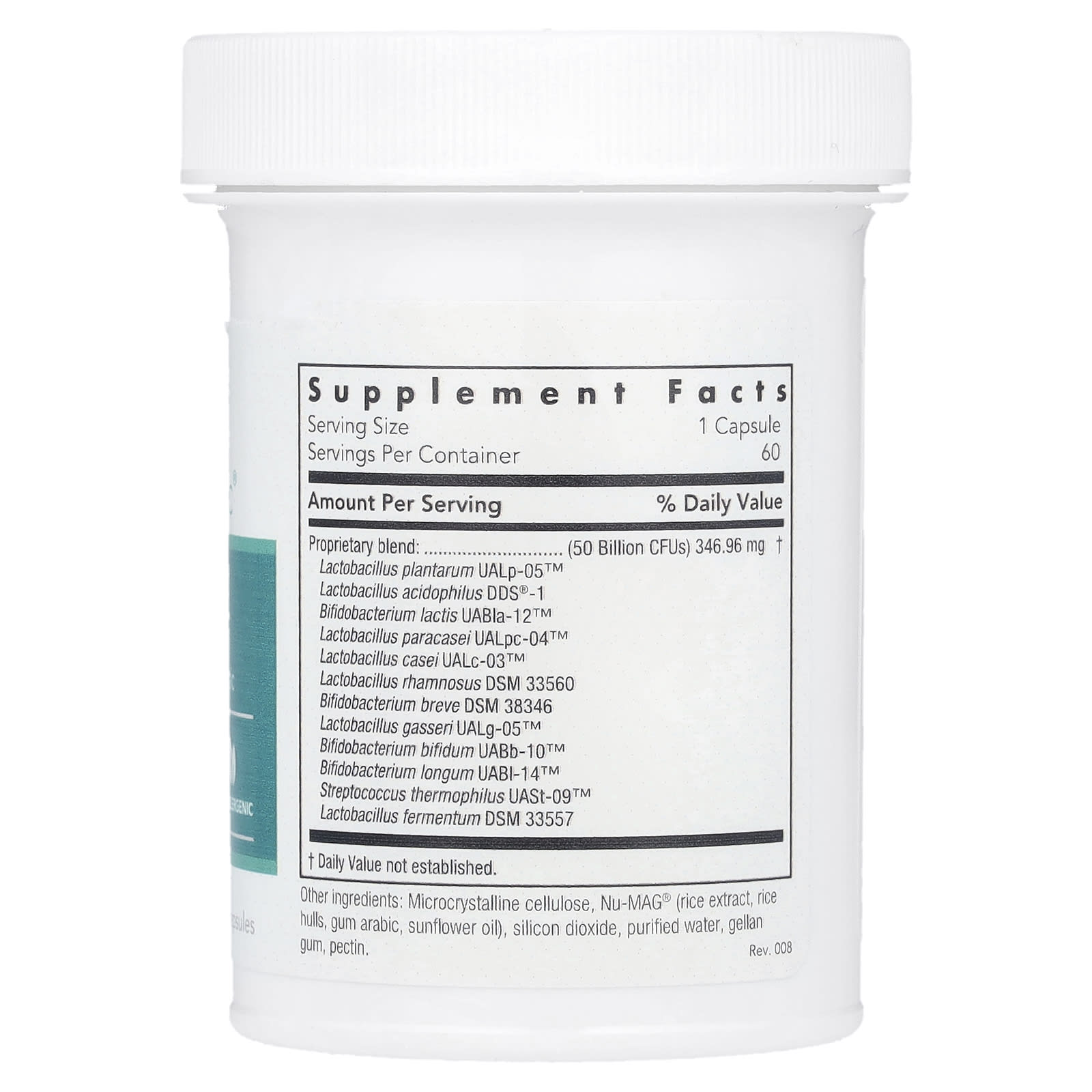 | Запатентованная смесь... (50 млрд КОЕ) Лактобактерии плантарум (Lactobacillus plantarum) UALp-05™ Ацидофильные лактобактерии (Lactobacillus acidophilus) DDS-1® Бифидобактерии лактис (Bifidobacterium lactis) UABla-12™ Лактобактерии параказеи (Lactobacillus paracasei) UALpc-04™ Лактобактерии казеи (Lactobacillus casei) UALc-03™ Лактобактерии рамнозус (Lactobacillus rhamnosus) DSM 33560 Бифидобактерии бреве (B. breve), штамм DSM 38346 Лактобактерии гассери (Lactobacillus gasseri) UALg-05™ Бифидобактерии бифидум (Bifidobacterium bifidum) UABb-10™ Бифидобактерии лонгум (Bifidobacterium longum) UABl-14™ Термофильный стрептококк (Streptococcus thermophilus) UASt-09™ Лактококк ферментум (Lactococcus fermentum) DSM 33557 | 346,96 мг | † |