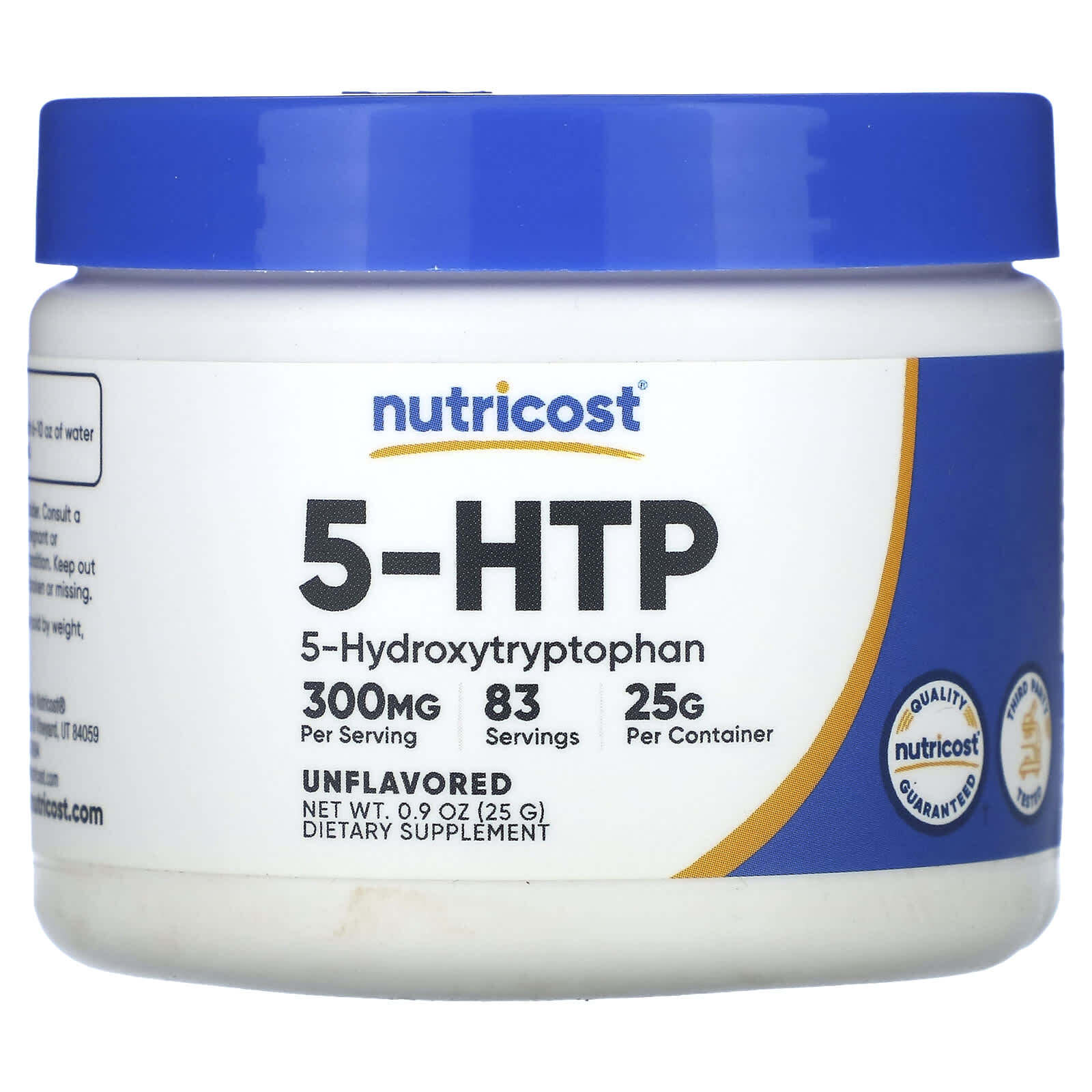 Флакон с порошком 5-HTP Nutricost содержит 25 граммов высококачественного 5-HTP без дополнительных наполнителей. 25 г порошка 5-HTP в 1 флаконе