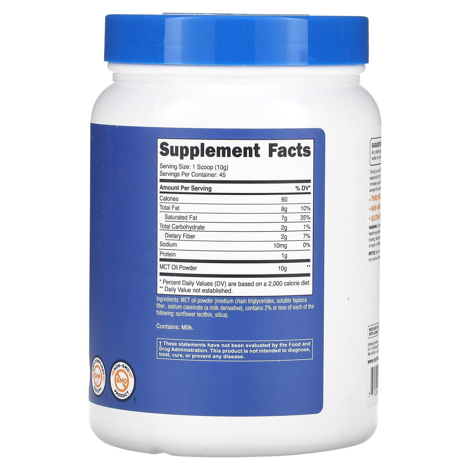 порошок из масла MCT (среднецепочечные триглицериды, растворимая тапиоковая клетчатка, казеинат натрия (производное от молока), содержит не более 2% следующих ингредиентов: подсолнечный лецитин, диоксид кремния).