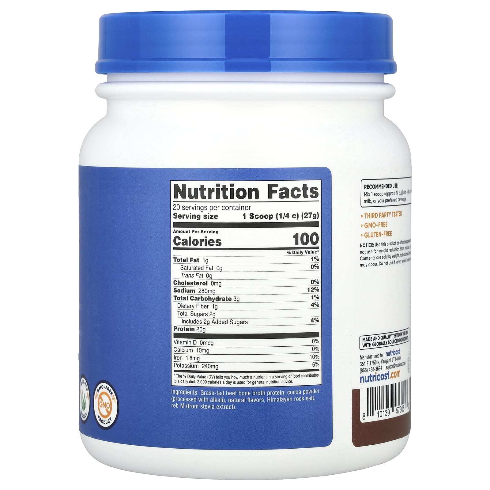 Протеин из говяжьего костного бульона травяного откорма, какао-порошок (обработанный щелочью), натуральные ароматизаторы, Гималайская каменная соль, реб М (из экстракта стевии).