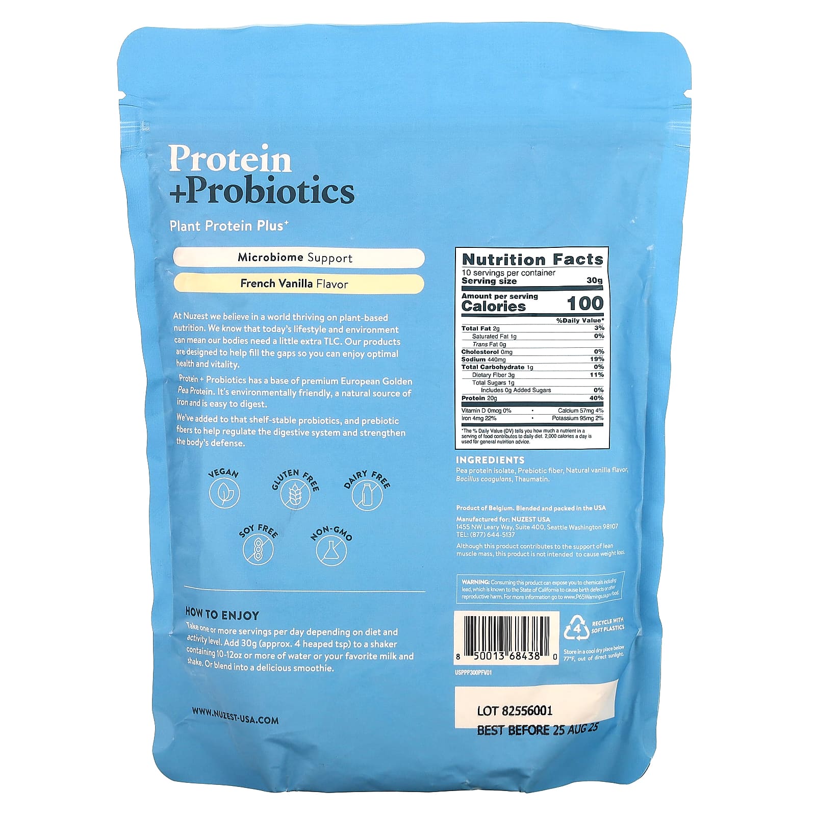 Изолят горохового белка, пребиотическая клетчатка, натуральный ароматизатор «Ваниль», бактерии бациллус коагуланс (B. coagulans), тауматин.