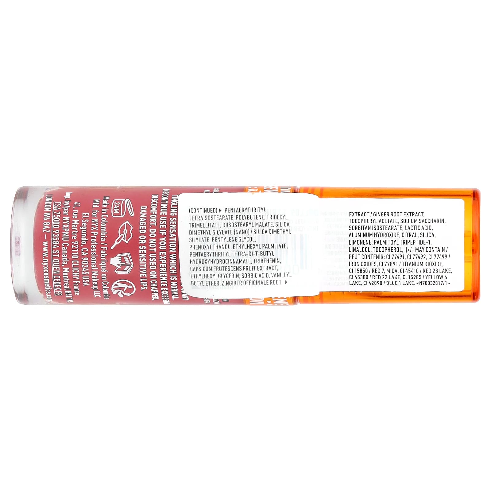 C18-36 кислоты триглицерид, бис-диглицерил полиациладипат-2, Пентаэритритил тетраизостеарат, полибутен, тридецил тримеллитат, диизостеарил малат, диметилсилилат диоксида кремния [нано] / диметилсилилат диоксида кремния, пентилен гликоль, феноксиэтанол, этилгексил пальмитат, пентаэритритил тетра-ди-трет-бутил гидроксигидроциннамат, трибехенин, экстракт плодов стручкового перца, этилгексилглицерин, сорбиновая кислота, ванилилбутиловый эфир, экстракт корня Zingiber officinale / экстракт корня имбиря, токоферилацетат, сахарин натрия, сорбитан изостеарат, молочная кислота, гидроксид алюминия, цитраль, диоксид кремния, лимонен, пальмитоил трипептид-1, линалоол, токоферол, [+/- может содержать / peut contenir: ci 77491, CI 77492, CI 77499 / оксиды железа, CI 77891 / диоксид титана, CI 15850 / красный 7, слюда, CI 45410 / красный 28 лак, CI 45380 / красное 22 озеро, CI 15985 / желтый 6 лак, CI 42090 / Blue 1 Lake.