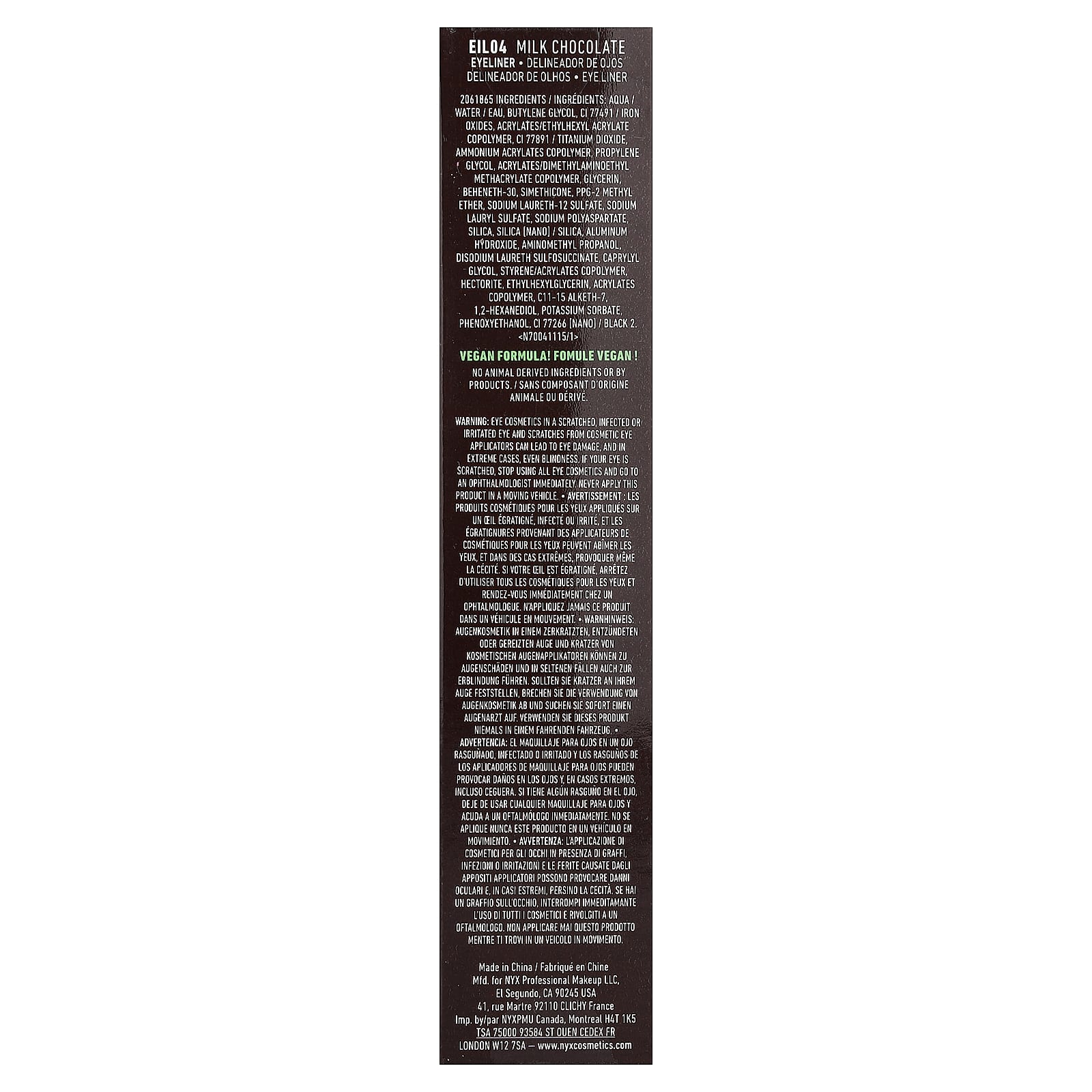 Косметика для глаз на поцарапанном, инфицированном или раздраженном глазу, а также царапины от косметических аппликаторов для глаз могут привести к повреждению глаз, а в крайних случаях даже к слепоте. Если вы поцарапали глаз, прекратите использование косметики для глаз и немедленно обратитесь к офтальмологу. Никогда не используйте этот продукт в движущемся транспортном средстве.