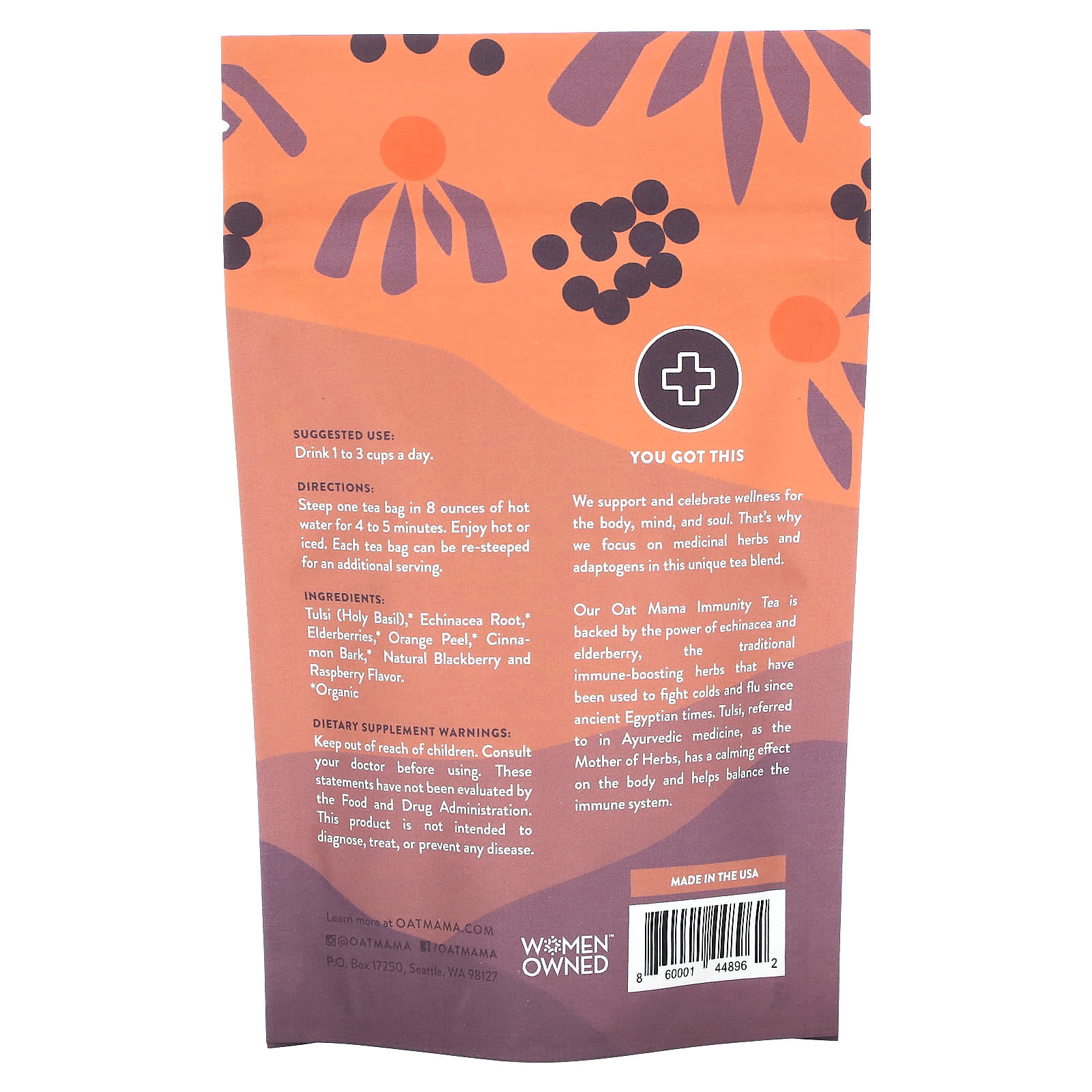 Наш чай Oat Mama для укрепления иммунитета содержит эхинацею и бузину, традиционные травы для укрепления иммунитета, которые использовались для борьбы с простудой и гриппом еще с Древнего Египта. Тулси, которую в аюрведической медицине называют матерью трав, оказывает успокаивающее действие на организм и помогает сбалансировать иммунную систему.