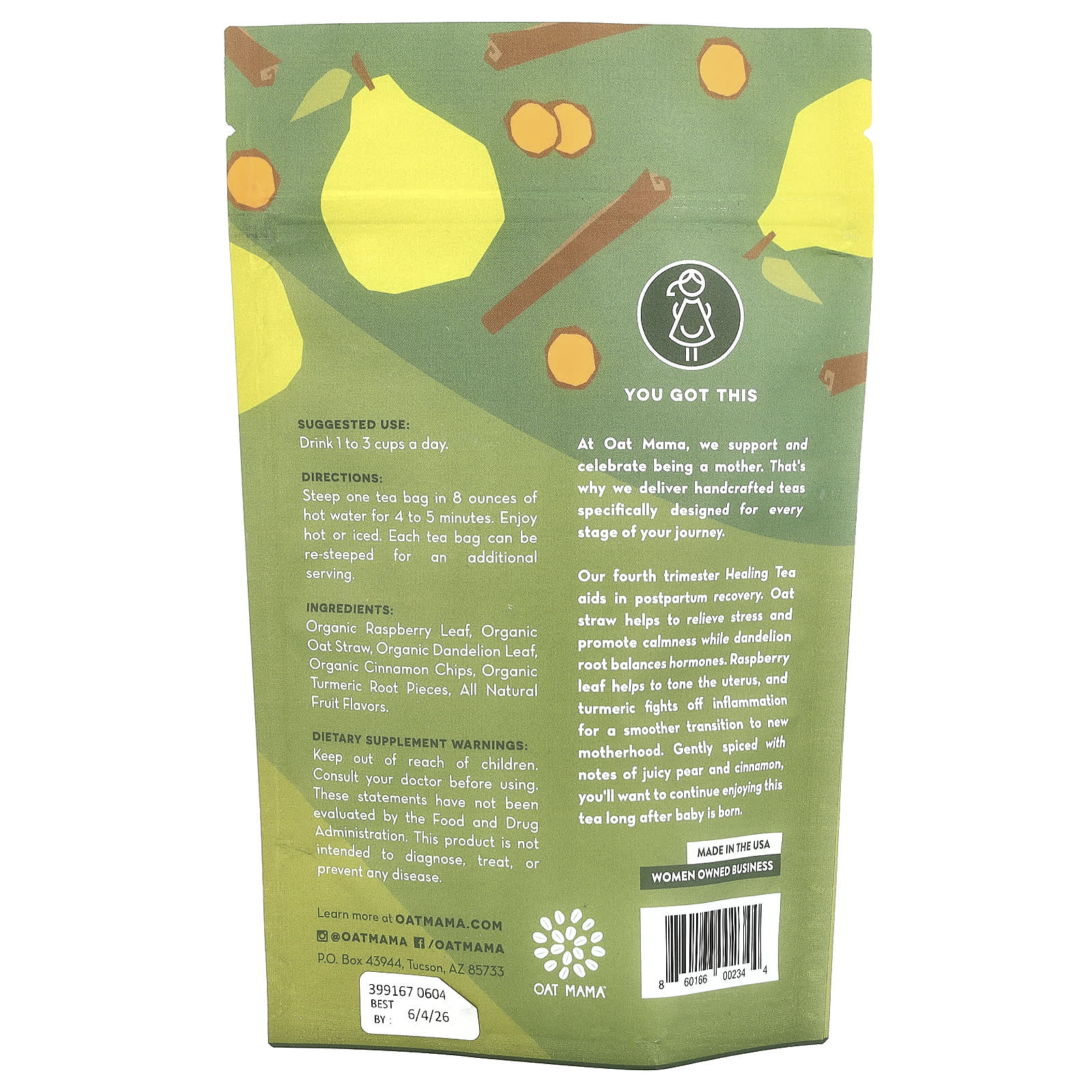 Наш лечебный чай в четвертом триместре помогает в послеродовом восстановлении. Овсяная солома помогает снять стресс и успокоить, а корень одуванчика уравновешивает гормоны. Листья малины тонизируют матку, а куркума борется с воспалениями, обеспечивая более плавный переход к материнству. С нежными нотками сочной груши и корицы вы захотите наслаждаться этим чаем еще долго после рождения ребенка.