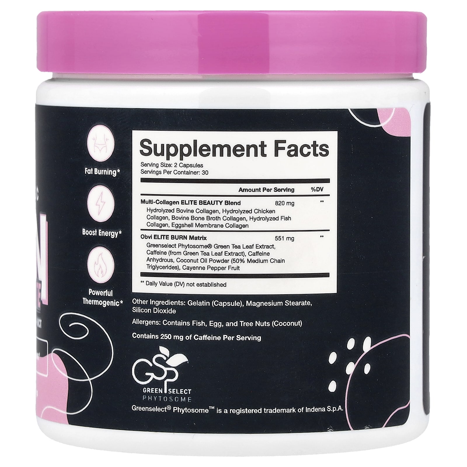 | Obvi ELITE BURN Matrix Экстракт листьев зеленого чая Greenselect Phytosome®, Кофеин (из экстракта листьев зеленого чая), кокос OII Порошок (50% среднецепочечных триглицеридов) | 370 мг | ** |
