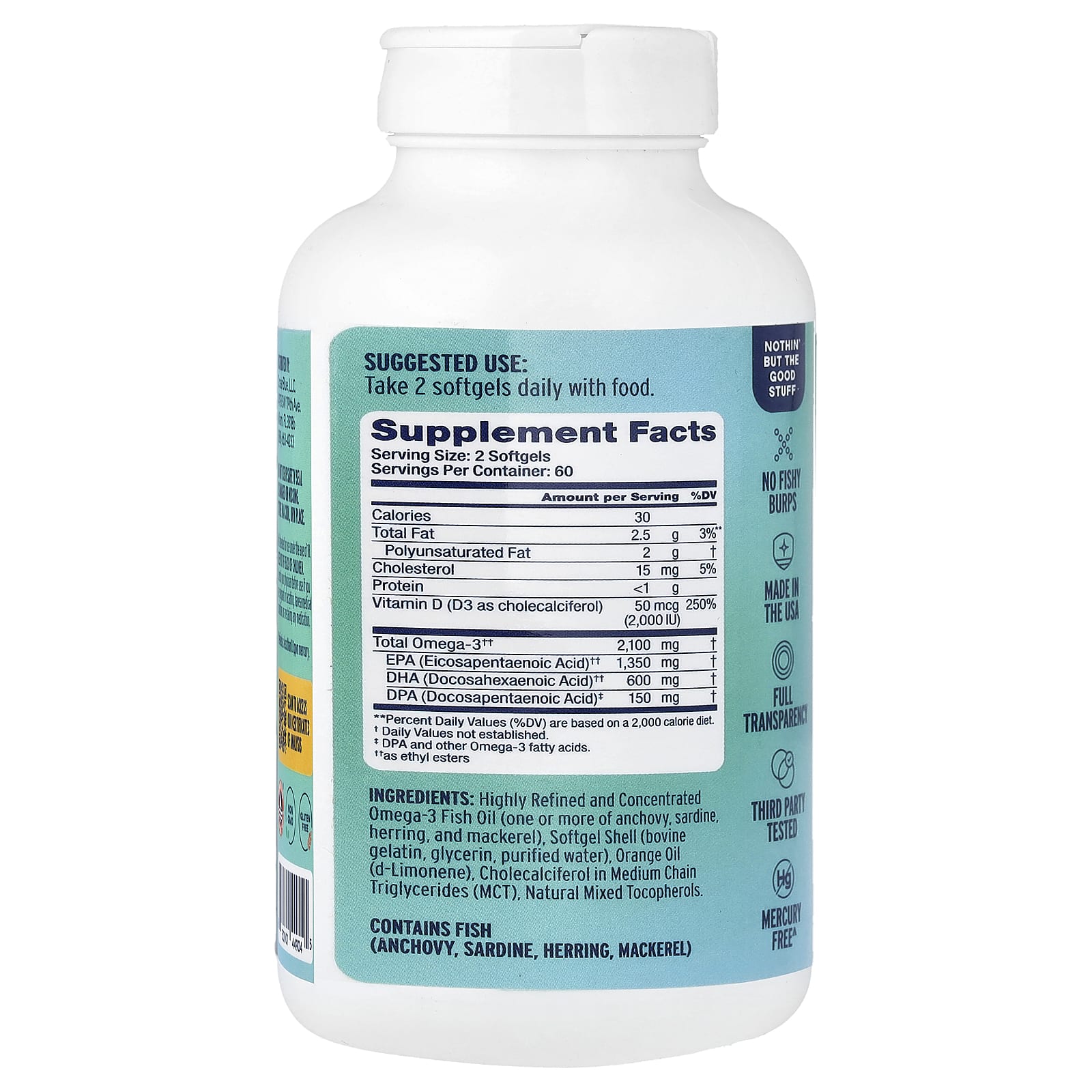 2100 мг омега-3 в сочетании с витамином D3 (неофициальным «солнечным» питательным веществом) для поддержки: