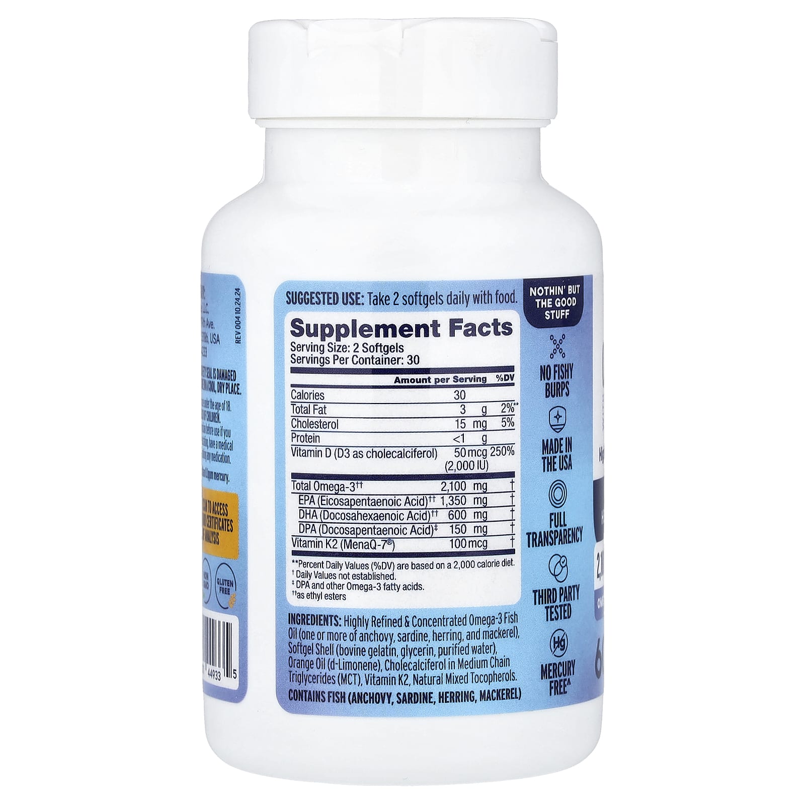 Высокоочищенный и концентрированный рыбий жир с омега-3 (один или несколько видов анчоуса, сардин, сельдь, макрель), оболочка капсулы (бычий желатин, глицерин, очищенная вода), апельсиновое масло (d-лимонен), холекальциферол в среднецепочечных триглицеридах (MCT), витамин K2, натуральная смесь токоферолов.
