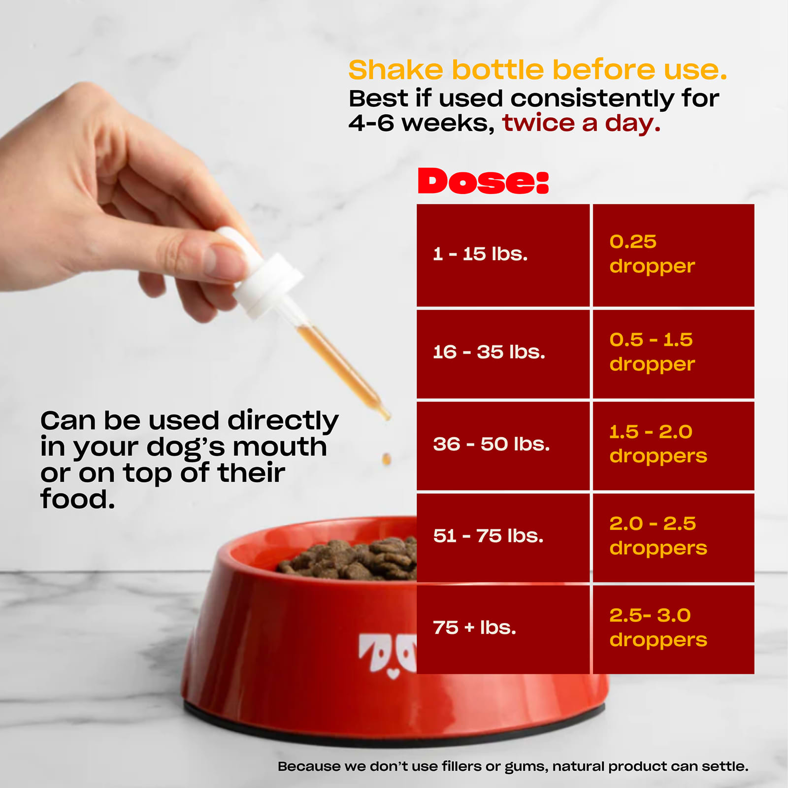 Хорошо встряхните перед использованием. Возможно выпадение осадка. Следуйте таблице веса для получения нужной дозы или следуйте рекомендациям ветеринара. Применять дважды в день. Это минимальная доза. Можно принимать во время или после еды.