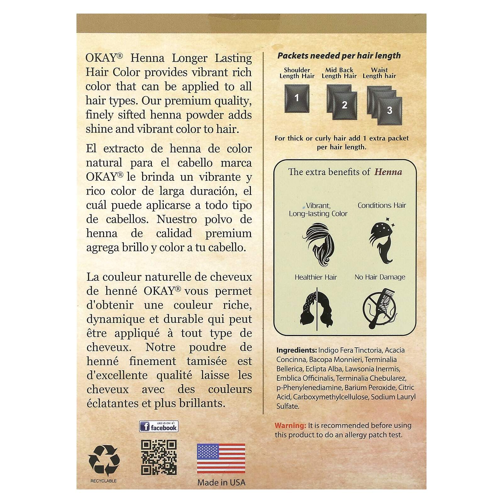 Стойкая краска для волос OKAY® обеспечивает яркий насыщенный цвет и подходит для всех типов волос. Наша тонко просеянная хна в порошке премиального качества придает волосам блеск и яркий цвет.
