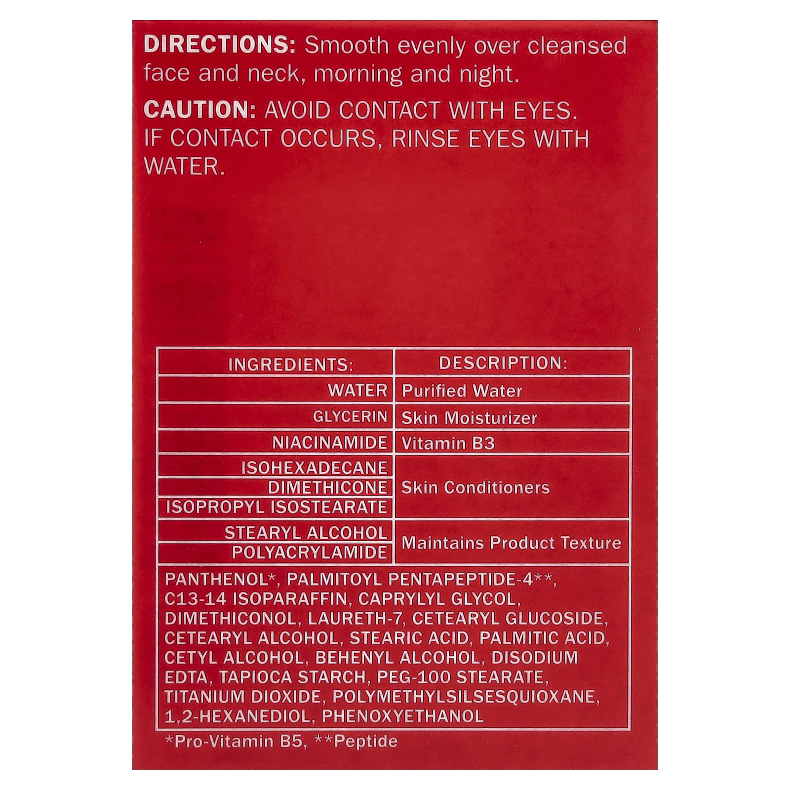 | Пантенол *, пальмитоил пентапептид-4 **, экстракт тремелы фуциформной (Tremella fuciformis sporocarp), тапиоковый крахмал, изопарафин c13-14, каприлилгликоль, диметиконол, лаурет-7, цетеариловый спирт, цетеарил глюкозид, пальмитиновая кислота, стеариновая кислота, цетиловый спирт динатрия эдта, ПЭГ-100 стеарат, диоксид титана, полиметилсилсесквиоксан, 1,2-гександиол, феноксиэтанол. * Провитамин B5, ** пептид | |