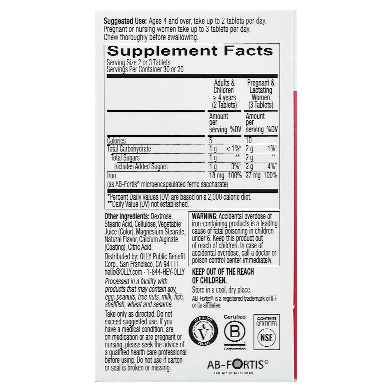 | Железо (в виде микрокапсулированного железа сахарата AB-Fortis®) | 18 мг | 100% | 27 мг | 100% |
