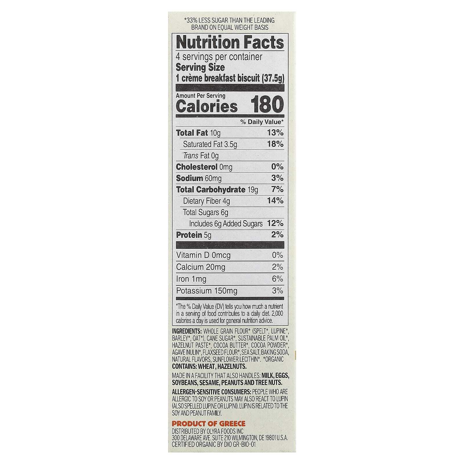Цельнозерновая мука* (из спельты*, овес*, люпин*, ячмень*), тростниковый сахар*, экологически чистое пальмовое масло*, паста из фундука*, какао-масло*, какао-порошок*, инулин из агавы*, льняная мука*, пищевая сода, морская соль, натуральные ароматизаторы, подсолнечный лецитин*.