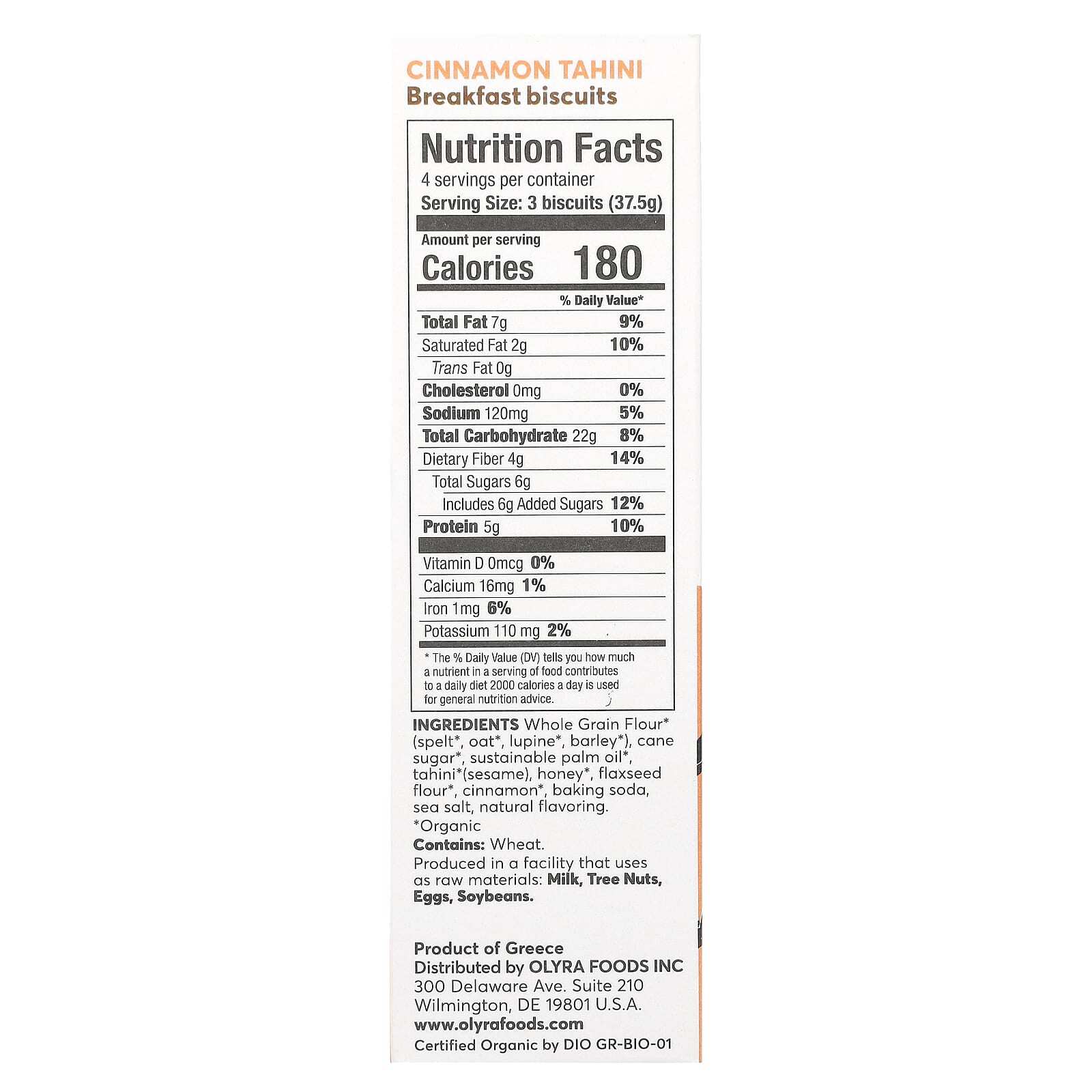 Цельнозерновая мука* (из спельты*, овес*, люпин*, ячмень*), тростниковый сахар*, экологически чистое пальмовое масло*, тахини* (кунжут), мед*, льняная мука*, корица*, пищевая сода, морская соль, натуральный ароматизатор.