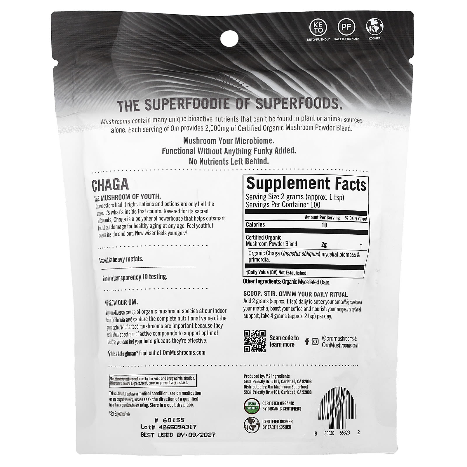 Грибы содержат множество уникальных биоактивных питательных веществ, которые невозможно найти только в растительных или животных источниках. Каждая порция Om содержит 2000 мг смеси сертифицированных органических грибов.
