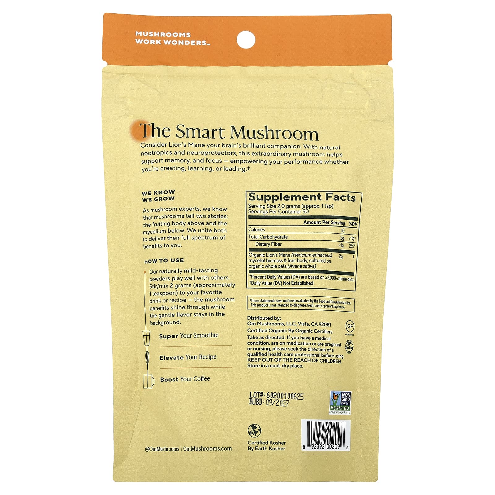 Om Mushrooms, ежовик гребенчатый, 100% сертифицированный органический грибной порошок, 100 г (3,5 унции)