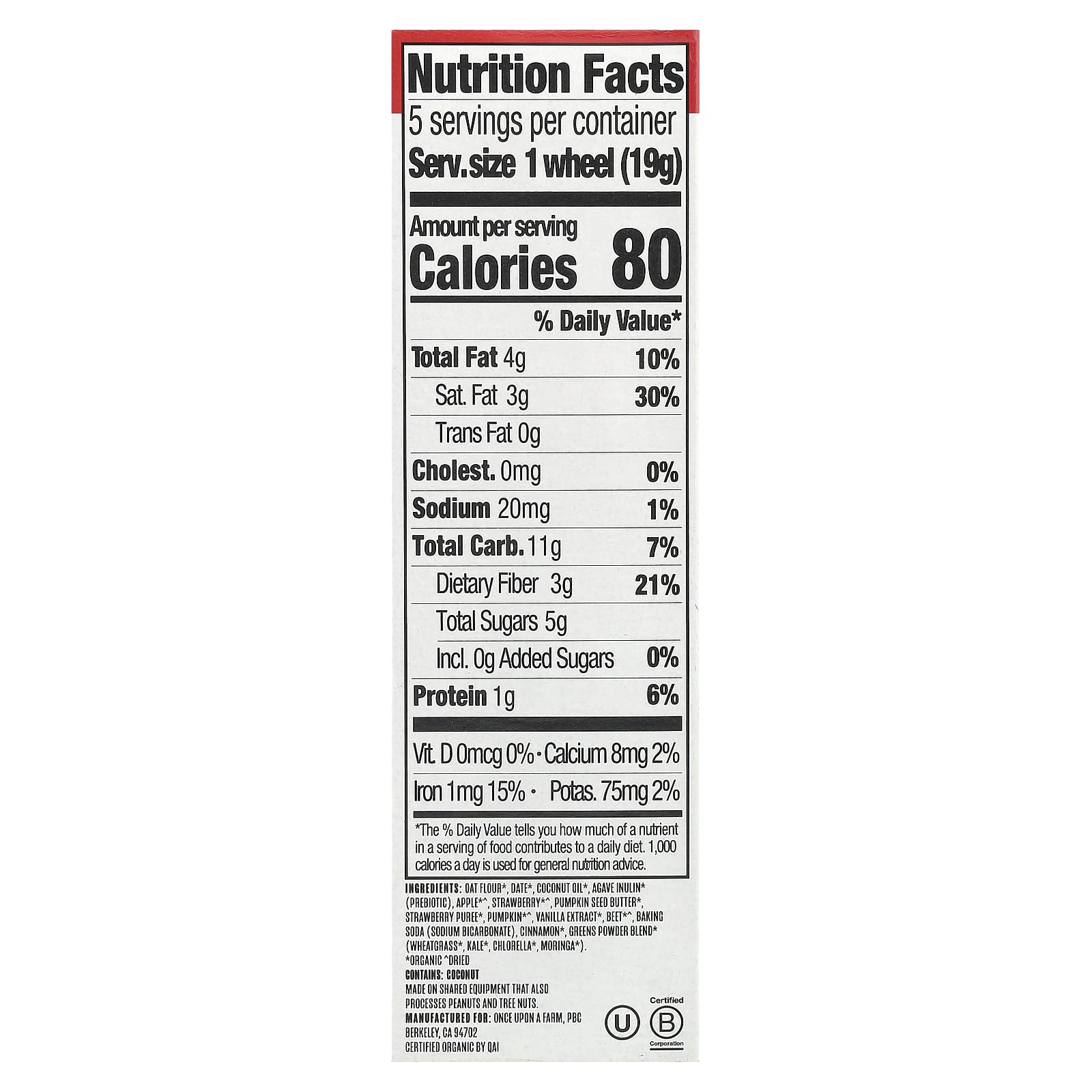 Овсяная мука *, дата *, кокосовое масло *, инулин агавы * (пребиотик), яблоко * ^, клубника * ^, масло из семян тыквы *, клубничное пюре *, тыква * ^, экстракт ванили *, свекла * ^, пищевая сода (бикарбонат натрия), корица *, смесь порошка зелени * (ростки пшеницы *, капуста *, хлорелла *, моринга *).