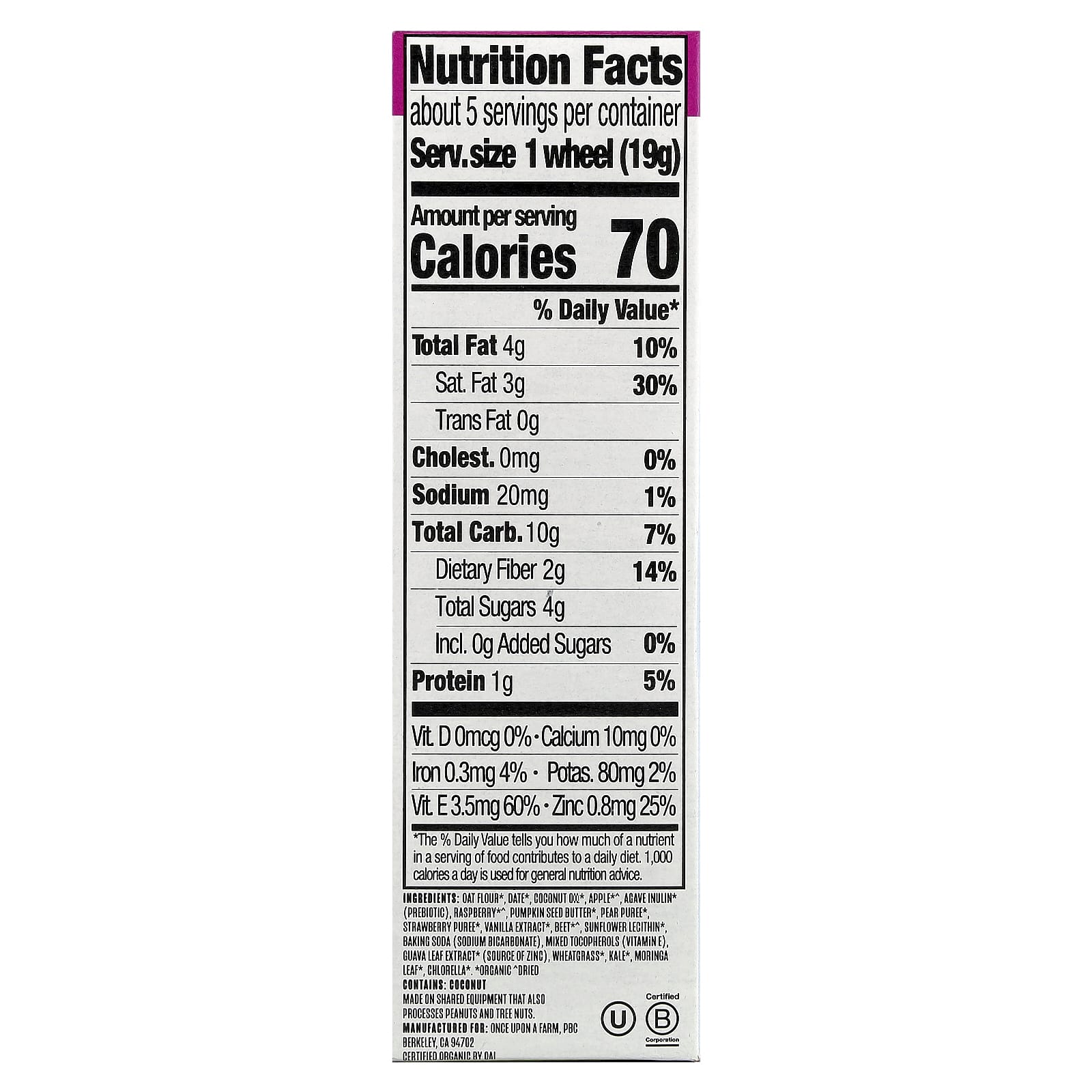 Овсяная мука *, дата *, кокосовое масло*, яблоко * ^, инулин агавы * пребиотик), малина * ^, масло из семян тыквы *, грушевое пюре *, клубничное пюре *, экстракт ванили *, свекла * ^, подсолнечный лецитин *, пищевая сода (бикарбонат натрия), смешанные токоферолы (витамин Е), экстракт листьев гуавы * (источник цинка), ростки пшеницы *, капуста кудрявая*, лист моринги *, хлорелла *.
