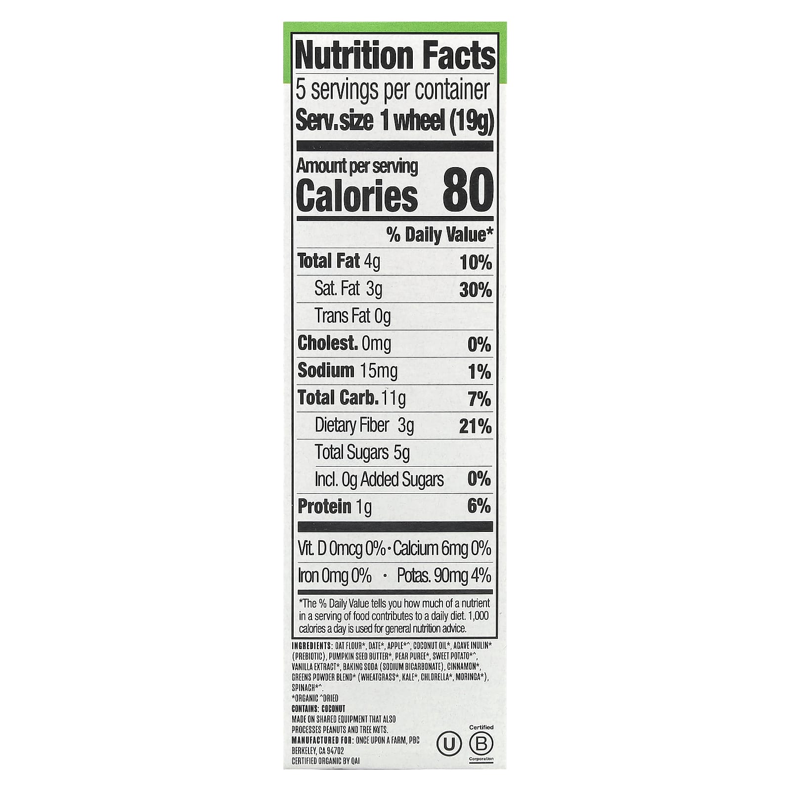 Овсяная мука *, дата *, яблоко * ^, кокосовое масло *, инулин агавы * (пребиотик), масло из семян тыквы *, грушевое пюре *, батат * ^, экстракт ванили *, пищевая сода (бикарбонат натрия), корица * смесь порошка зелени * (ростки пшеницы *, капуста кудрявая*, хлорелла *, моринга *), шпинат * ^.