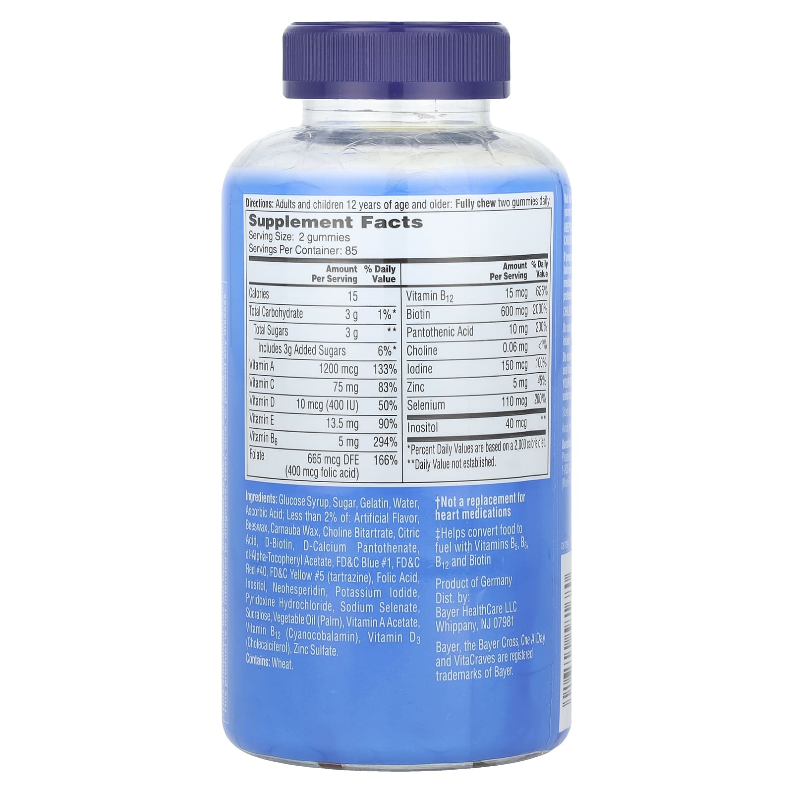 Крахмальная патока, сахар, желатин, вода, аскорбиновая кислота; ингредиенты, содержание которых менее 2%: искусственные ароматизаторы, пчелиный воск, карнаубский воск, битартрат холина, лимонная кислота, d-биотин, d-пантотенат кальция, dl-альфа-токоферил ацетат, краситель синий 1 FD&C, краситель красный 40 FD&C, краситель желтый 5 FD&C (тартразин), фолиевая кислота, инозитол, неогесперидин, йодид калия, пиридоксина гидрохлорида, селенат натрия, сукралоза, растительное масло (пальмовое), ацетат витамина A, витамин B12 (цианокобаламин), витамин d3 (холекальциферол), сульфат цинка.