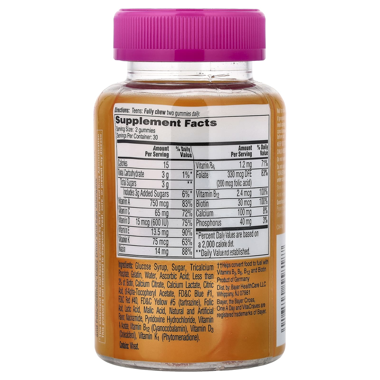 Крахмальная патока, сахар, трикальцийфосфат, желатин, Вода, аскорбиновая кислота: менее 2% биотина, цитрат кальция, лактат кальция, лимонная кислота, dl-альфа-токоферилацетат, краситель синий 1 FD&C, краситель красный 40 FD&C, краситель желтый 5 FD&C (тартразин), фолиевая кислота, молочной кислоты, яблочная кислота, натуральные и искусственные ароматизаторы, Ниацинамид, пиридоксина гидрохлорид, ацетат витамина A, витамин В12 (цианокобаламин), витамин D3 (холекальциферол), витамин K1 (фитоменадион).