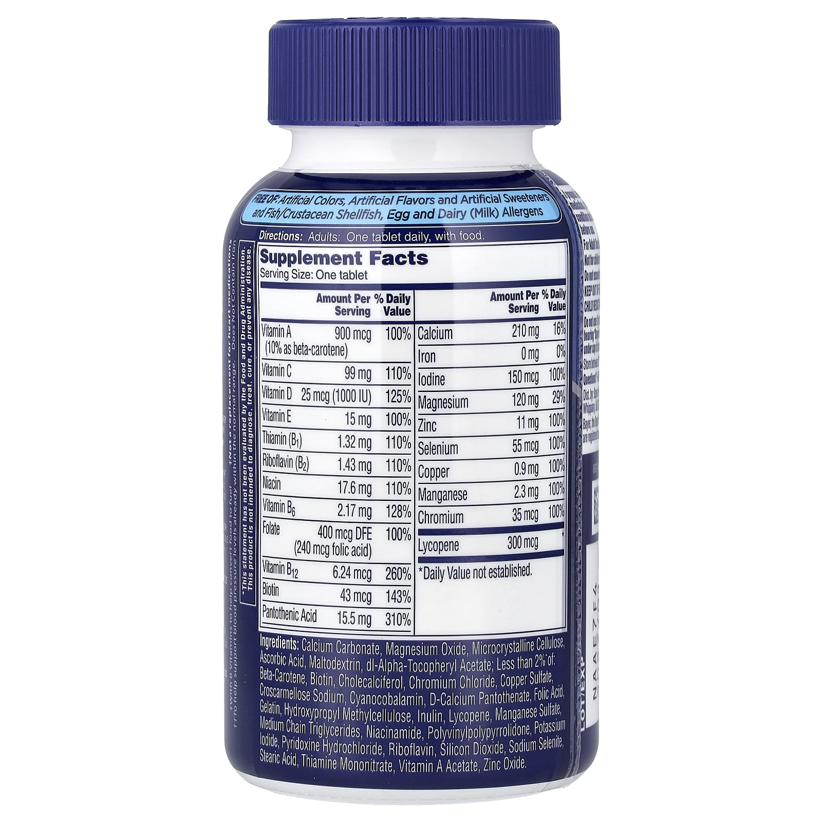 Карбонат кальция, оксид магния, микрокристаллическая целлюлоза, аскорбиновая кислота, мальтодекстрин, dl-альфа-токоферилацетат, менее 2% таких веществ: бета-каротин, биотин, холекальциферол, хлорид хрома, сульфат меди, кроскармеллоза натрия, цианокобаламин, d-пантотенат кальция, фолиевая кислота, желатин, гидроксипропилметилцеллюлоза, инулин, ликопин, сульфат марганца, среднецепочечные триглицериды, никотинамид, филлохинон, полидекстроза, поливинилполипирролидон, йодид калия, пиридоксина гидрохлорид, рибофлавин, диоксид кремния, селенит натрия, стеариновая кислота, тальк, тиамина мононитрат, триацетин, ацетат витамина A, оксид цинка.
