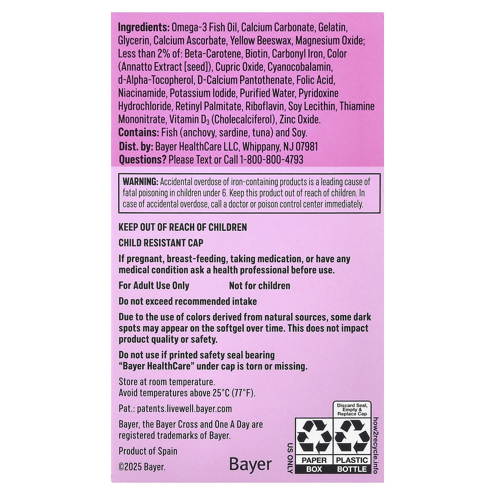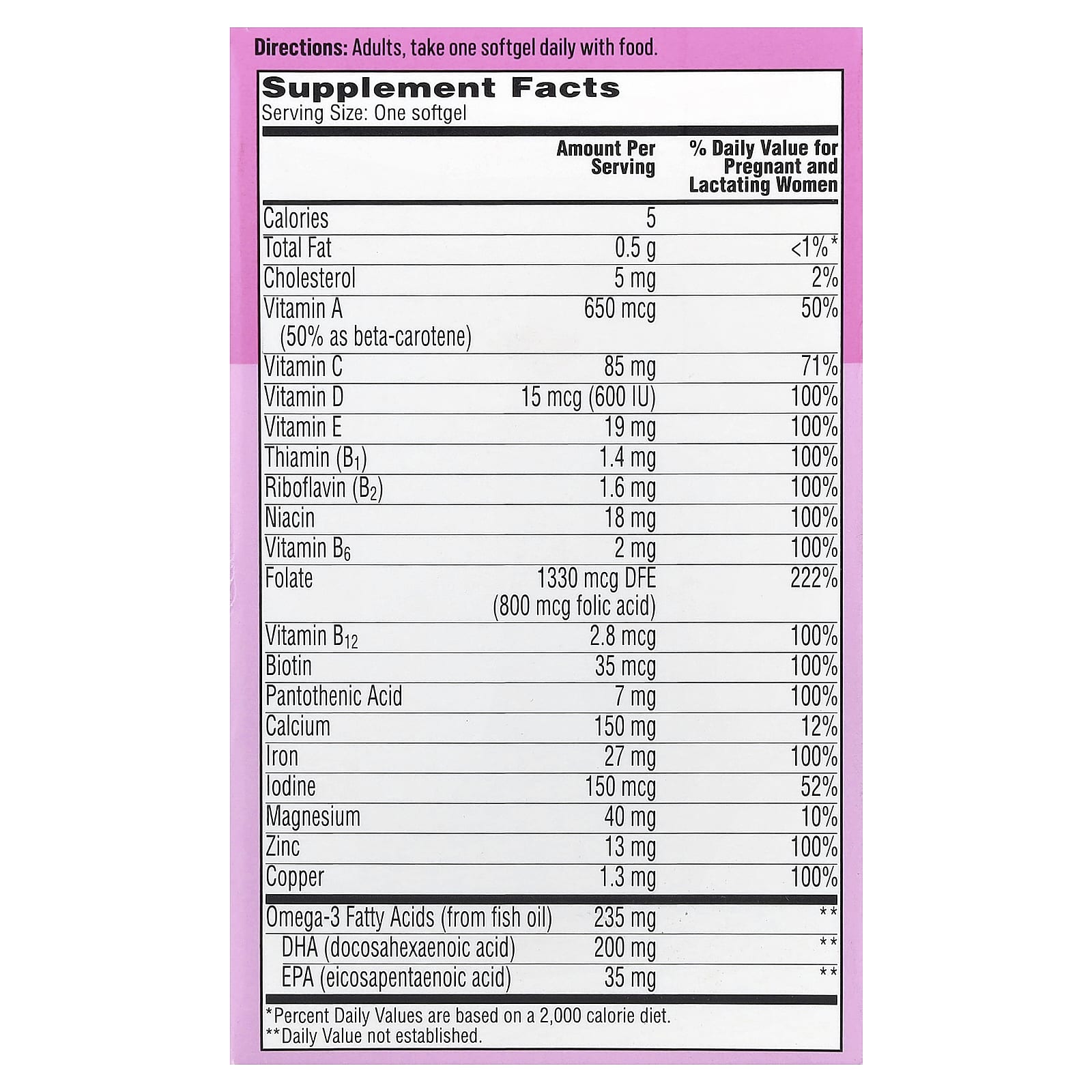 Рыбий жир с омега-3, карбонат кальция, желатина, глицерин, аскорбат кальция, желтый пчелиный воск, оксид магния; менее 2% бета-каротин, биотин, карбонильное железо, краситель (экстракт аннато [семена]), монооксид меди, цианокобаламин, d-альфа-токоферол, d-пантотенат кальция, фолиевая кислота, никотинамид, йодид калия, очищенная вода, пиридоксина гидрохлорид, ретинилпальмитат, рибофлавин, соевый лецитин, тиамина мононитрат, витамин D3 (холекальциферол), оксид цинка.