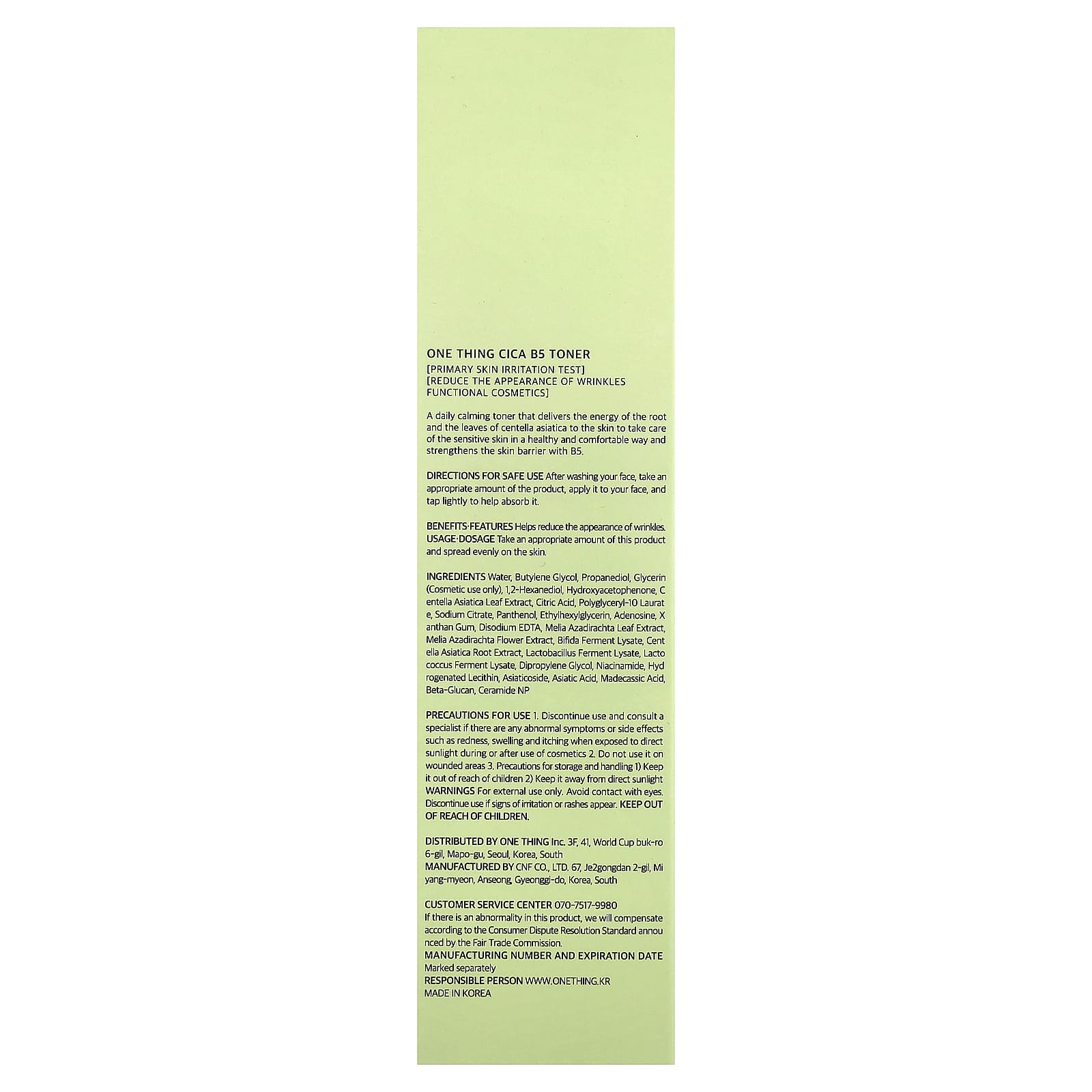 Вода, бутиленгликоль, пропандиол, глицерин (только для косметического применения), 1,2-гександиол, гидроксиацетофенон, экстракт листьев готу колы (Centella asiatica), лимонная кислота, полиглицерил-10 лаурат, цитрат натрия, пантенол, этилгексилглицерин, аденозин, ксантановая камедь, двунатриевая ЭДТК, экстракт листьев дерева ним (Melia azadirachta), экстракт цветков дерева ним (Melia azadirachta), лизат ферментов бифидобактерий, экстракт корня готу колы (Centella asiatica), лизат продукта ферментации лактобактерий, лизат ферментов лактококка, дипропиленгликоль, никотинамид, гидрогенизированный лецитин, азиатикозид, азиатиковая кислота, мадекассовая кислота, бета-глюкан, керамид NP.