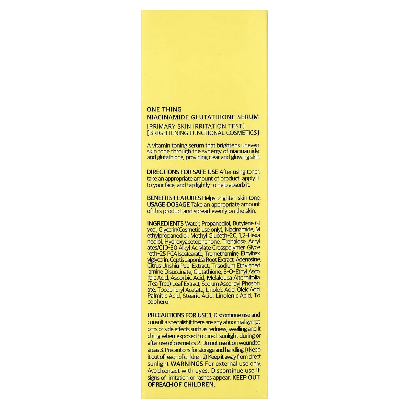 Вода, пропандиол, бутиленгликоль, глицерин (только для косметического применения), никотинамид, метилпропандиол, метил глюцет-20, 1,2-гександиол, гидроксиацетофенон, трегалоза, акрилат/c10-30 алкил акрилат кроссполимер, глицерет-25 пирролидонкарбонат, трометамин, этилгексилглицерин, экстракт корня коптиса японского (Coptis japonica), аденозин, экстракт цедры мандарина уншиу (Citrus unshiu), тринатрия этилендиамин дисукцинат, глутатион, 3-о-этил-аскорбиновая кислота, аскорбиновая кислота, экстракт листьев чайного дерева (Melaleuca alternifolia), аскорбил фосфат натрия, токоферилацетат, линолевая кислота, олеиновая кислота, пальмитиновая кислота, стеариновая кислота, линоленовая кислота, токоферол.