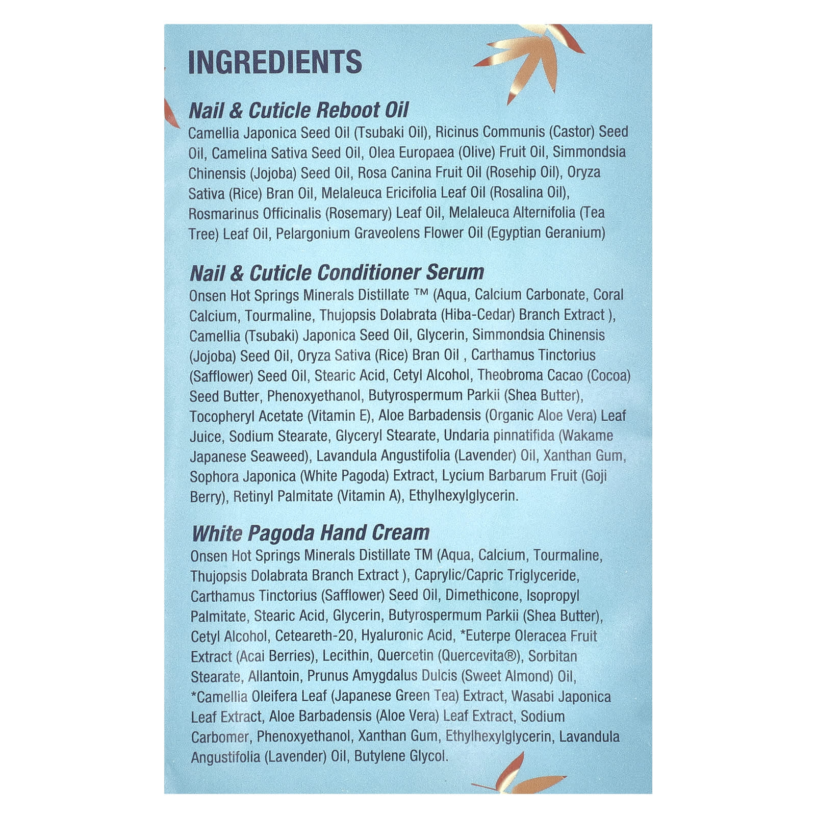 Используйте ежедневно, чтобы обеспечить немедленное и длительное увлажнение. Просто нанесите небольшое количество средства на каждое ногтевое ложе и помассируйте, нежно надавливая на кожу большим пальцем. Используйте отдельно или в дополнение к маслу Onsen Nail Reboot Oil.