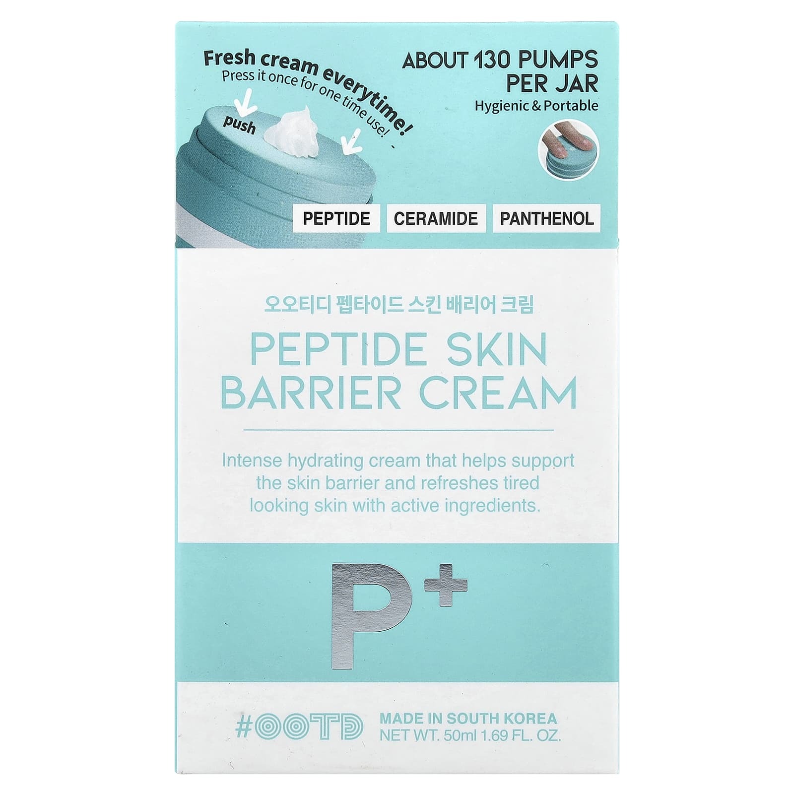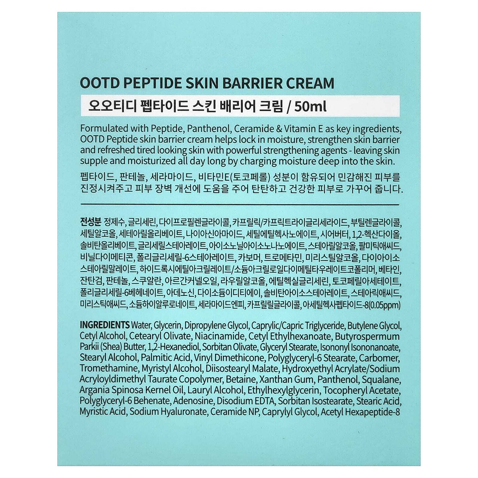 Пептидный барьерный крем OOTD, в состав которого входят пептид, пантенол, керамид и витамин Е в качестве основных ингредиентов, помогает удерживать влагу, укрепляет кожный барьер и освежает уставшую кожу благодаря мощным укрепляющим агентам, делая кожу эластичной и увлажненной на весь день, заряжая влагой глубоко в кожу. кожа.
