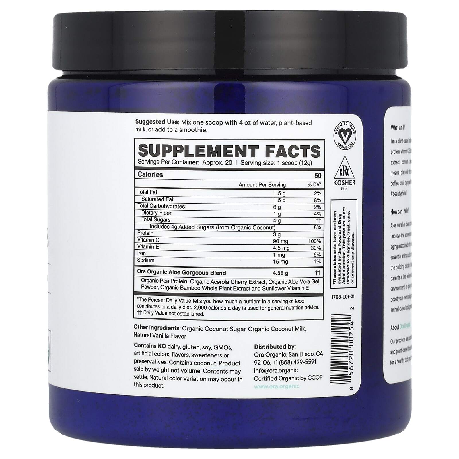 Алоэ вера было изучено на предмет его способности помогать улучшить появление морщин и признаков старения, связанных с деградацией коллагена, а незаменимые аминокислоты в белке и витамин С являются строительными блоками для выработки коллагена. Мои родители в Ora считают, что для вас (и для окружающей среды) лучше давать своему организму то, что ему нужно для увеличения выработки коллагена - коллаген животного происхождения не требуется.