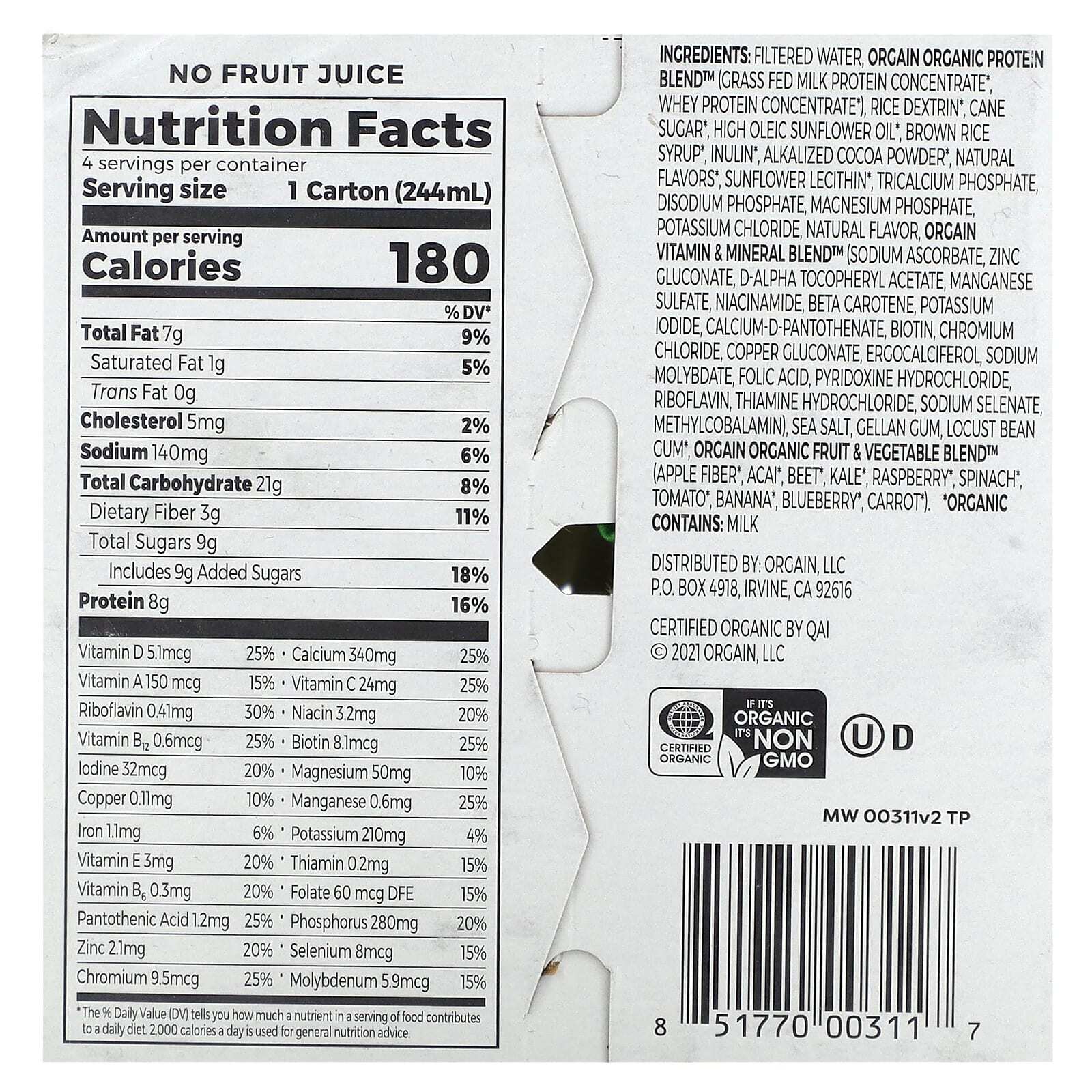 Очищенная вода, orgain Organic Protein Blend ™ (концентрат молочного протеина травяного откорма * концентрат сывороточного протеина *), рисовый декстрин *, тростниковый сахар*, высокоолеиновое подсолнечное масло*, сироп из бурого риса*, инулин*, подщелачиваемый какао-порошок *, натуральные ароматизаторы*, лецитин подсолнечника*, трикальций фосфат, динатрий фосфат, фосфат магния, хлорид калия, натуральный ароматизатор, органический витамин и витамин минеральная смесь ™ (аскорбат натрия, глюконат цинка, d-альфа токоферилацетат, сульфат марганца, никотинамид, бета-каротин, йодид калия, d-пантотенат кальция, биотин, хлорид хрома, глюконат меди, эргокальциферол, молибдат натрия, фолиевая кислота, пиридоксина гидрохлорид, рибофлавин, тиамина гидрохлорид, селенат натрия, метилкобаламин), морская соль, геллановая камедь, камедь рожкового дерева *, органические фрукты овощная смесь ™ (яблочная клетчатка *, асаи *, свекла*, капуста кудрявая*, малина *, шпинат *, томат *, банан*, голубика*, carrot*).