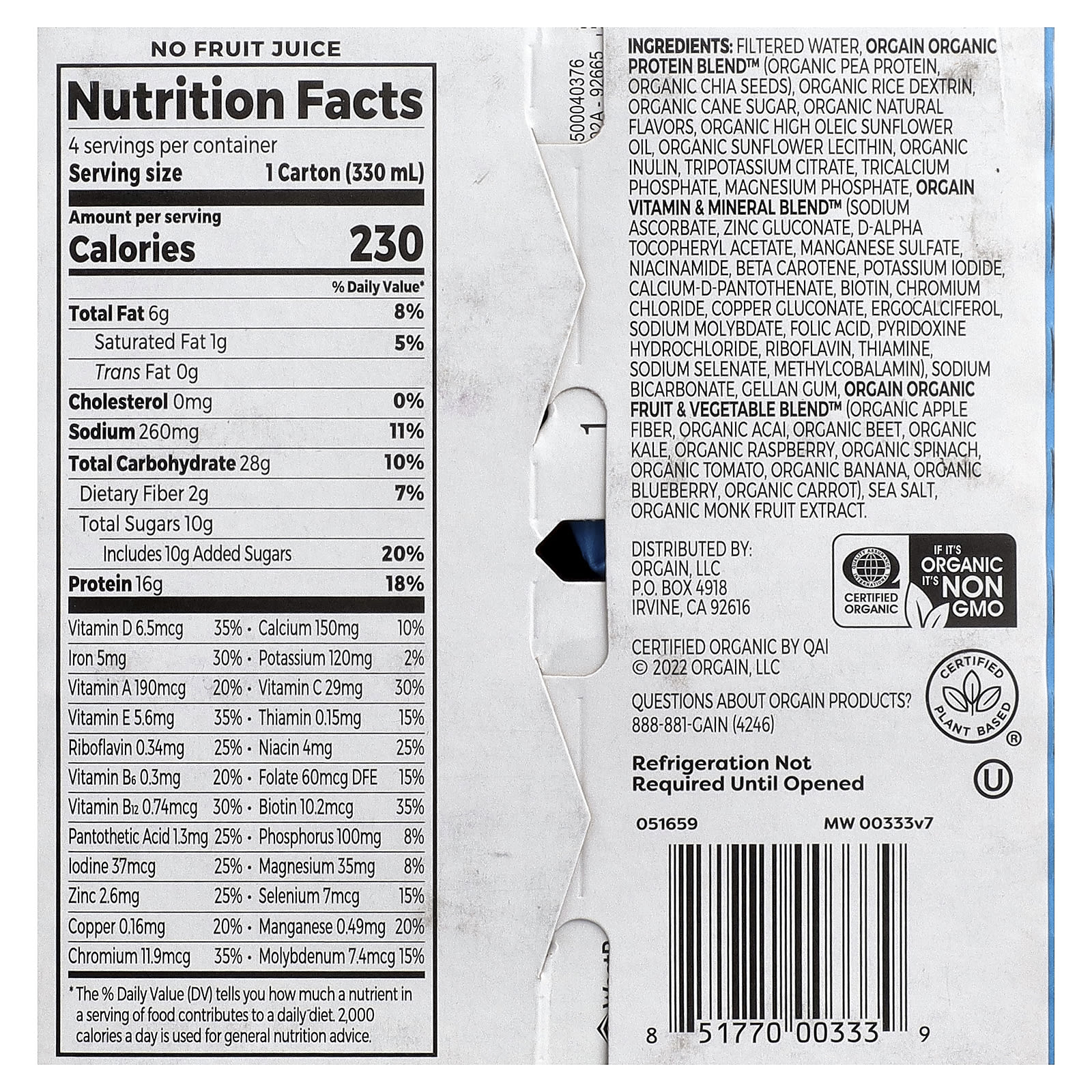 Очищенная вода, смесь органического протеина Orgain Organic Protein™ (органический гороховый белок, органические семена чиа), органический рисовый декстрин, органический тростниковый сахар, органические натуральные ароматизаторы, органическое высокоолеиновое подсолнечное масло, органический подсолнечный лецитин, органического инулина, цитрат трикалия, трикальцийфосфат, фосфат магния, органический витамин & minerals blend™ (аскорбат натрия, глюконат цинка, d-альфа токоферилацетат, сульфат марганца, никотинамид, бета-каротин, йодид калия, d-пантотенат кальция, биотин, хлорид хрома, глюконат меди, эргокальциферол, молибдат натрия, фолиевая кислота, пиридоксина гидрохлорид, рибофлавин, тиамин, селенат натрия, метилкобаламин), бикарбонат натрия, геллановая камедь, органические фрукты и овощи вегетарианская смесь™ (органическое яблочная клетчатка, органические ягоды асаи, органическая свекла, органическая капуста, органическая малина, органический шпинат, органический томат, органический банан, органическая голубика, органическая морковь), морская соль, органический экстракт архата.