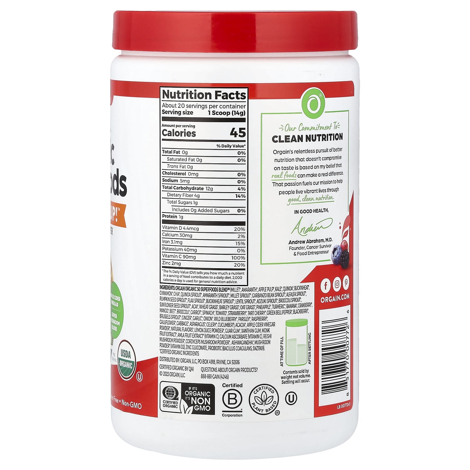 Смесь органических суперфудов Orgain organic 50 superfoods blend™ (просо*, амарант*, мякоть яблока*, капуста кудрявая*, киноа*, гречка*, корица*, чиа*, ростки киноа*, ростки амаранта*, ростки проса*, ростки нута*, ростки люцерны*, ростки семян тыквы*, ростки льна*, ростки гречихи*, ростки чечевицы*, ростки адзуки*, ростки брокколи*, ростки семян подсолнечника*, асаи*, ростки пшеницы*, ростки ячменя*, ростки овса*, ананас*, куркума*, банан*, клюква*, манго*, свекла*, брокколи*, морковь*, шпинат*, томат*, клубника*, вишня*, зеленый болгарский перец*, ежевика*, брюссельская капуста*, имбирь*, чеснок*, лук репчатый*, дикорастущая голубика*, петрушка*, малина*, цветная капуста*, кочанная капуста*, спаржа*, сельдерей*, огурец*), акация*, порошок из яблочного уксуса*, натуральные ароматизаторы*, порошок из сока лимона*, гуаровая камедь*, ксантановая камедь, экстракт архата*, экстракт плодов амлы* (витамин C), аскорбат кальция (витамин C), порошок из грибов рейши*, порошок из гриба кордицепс*, ашваганда*, грибной порошок* (витамин D2), глюконат цинка, пробиотик (бактерии бациллус коагуланс (B. coagulans), sunz1969).