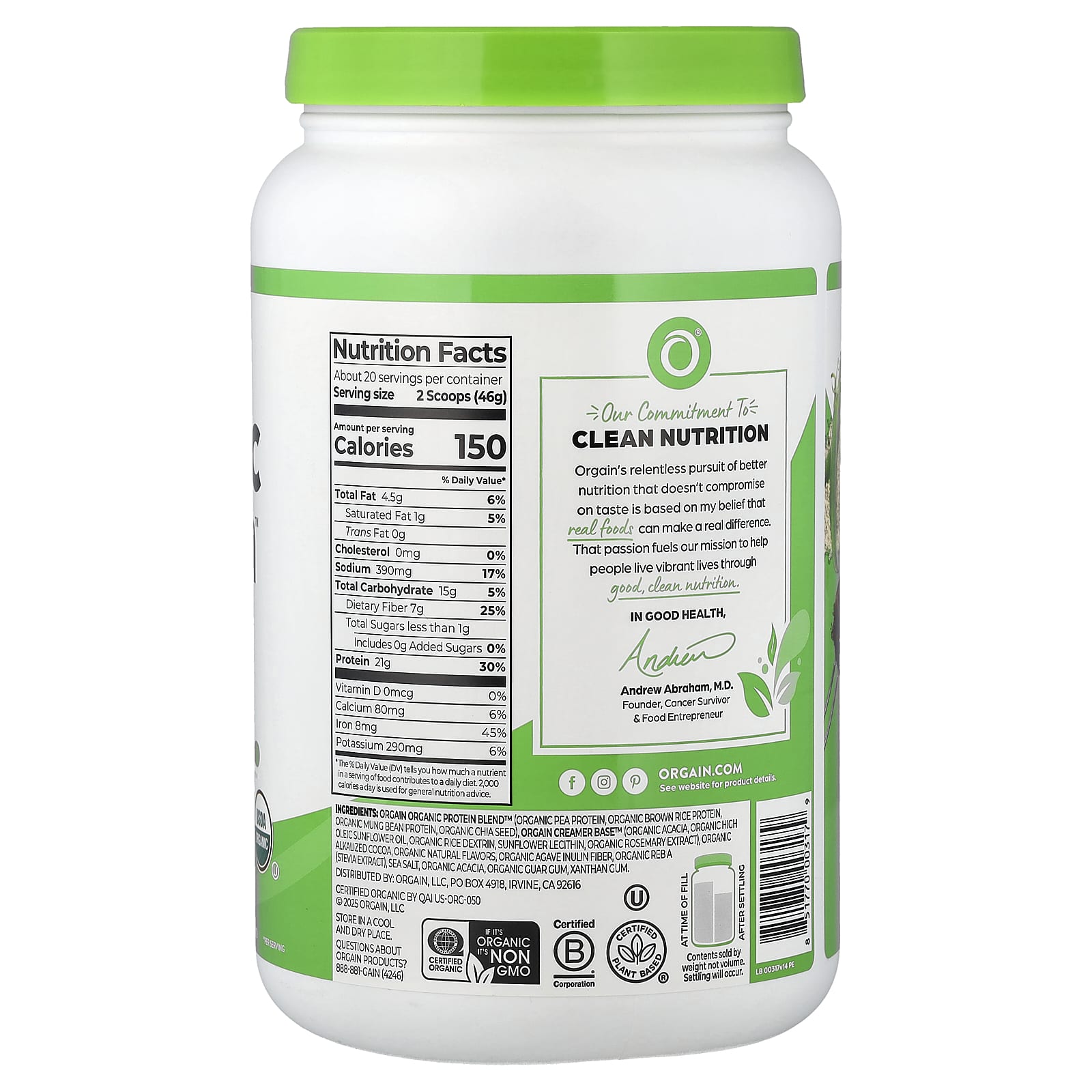 Смесь Orgain Organic Protein Blend™ (органический гороховый протеин, протеин из органического коричневого риса, протеин из органического маша, органические семена чиа), Orgain Creamer Base™ (органическая акация, органическое высокоолеиновое подсолнечное масло, органический рисовый декстрин, Лецитин подсолнечника, органический экстракт розмарина), органическое обработанное щёлочью какао, органические натуральные ароматизаторы, органическая клетчатка из инулина агавы, органический ребаудиозид А (экстракт стевии), морская соль, органическая акация, органическая гуаровая камедь, Ксантановая камедь.