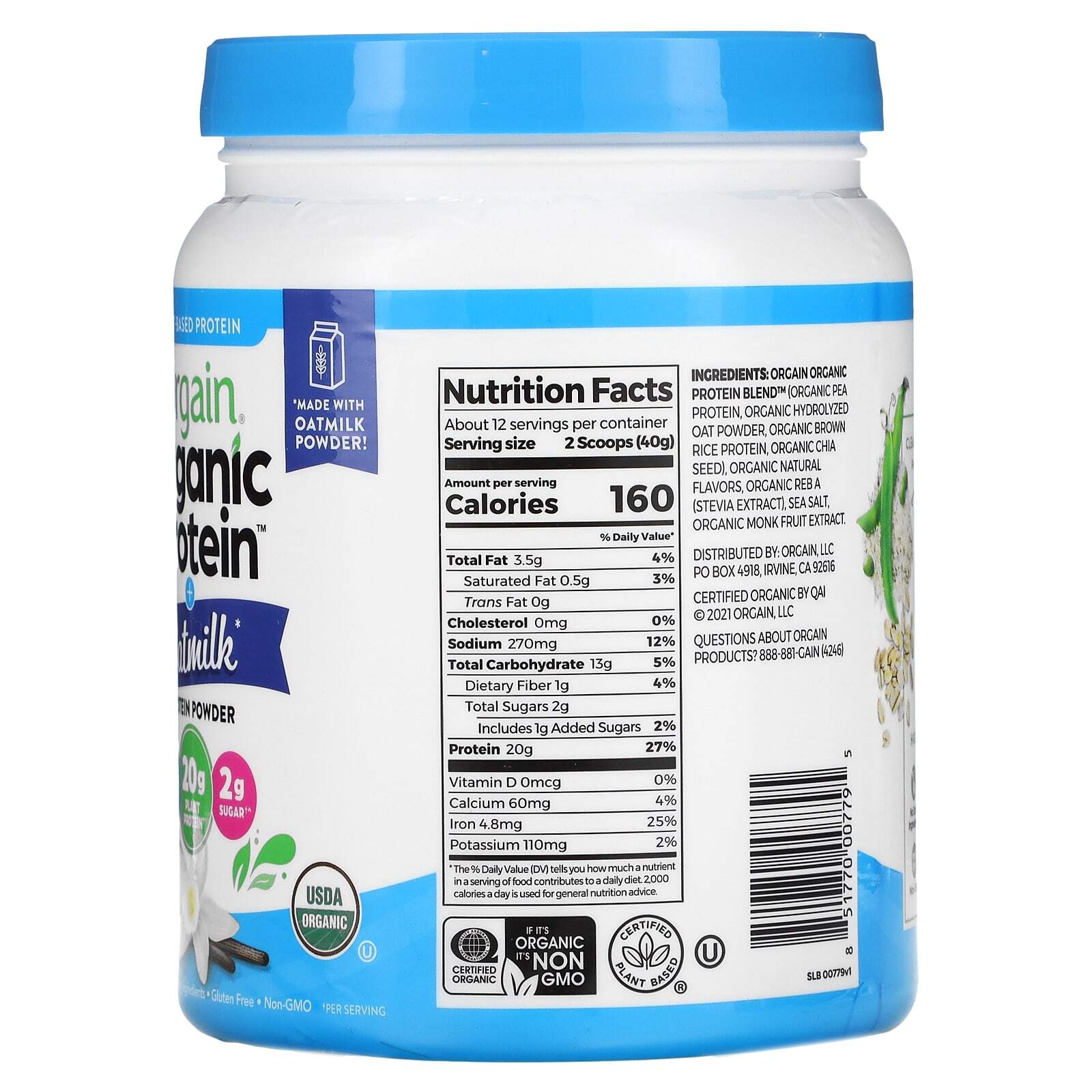 Смесь Orgain Organic Protein Blend™ (органический гороховый протеин, органический гидролизованный порошок из овса, протеин из органического бурого риса, органические семена чиа), органические натуральные ароматизаторы, органический ребаудиозид А (экстракт стевии), морская соль, экстракт органического архата.