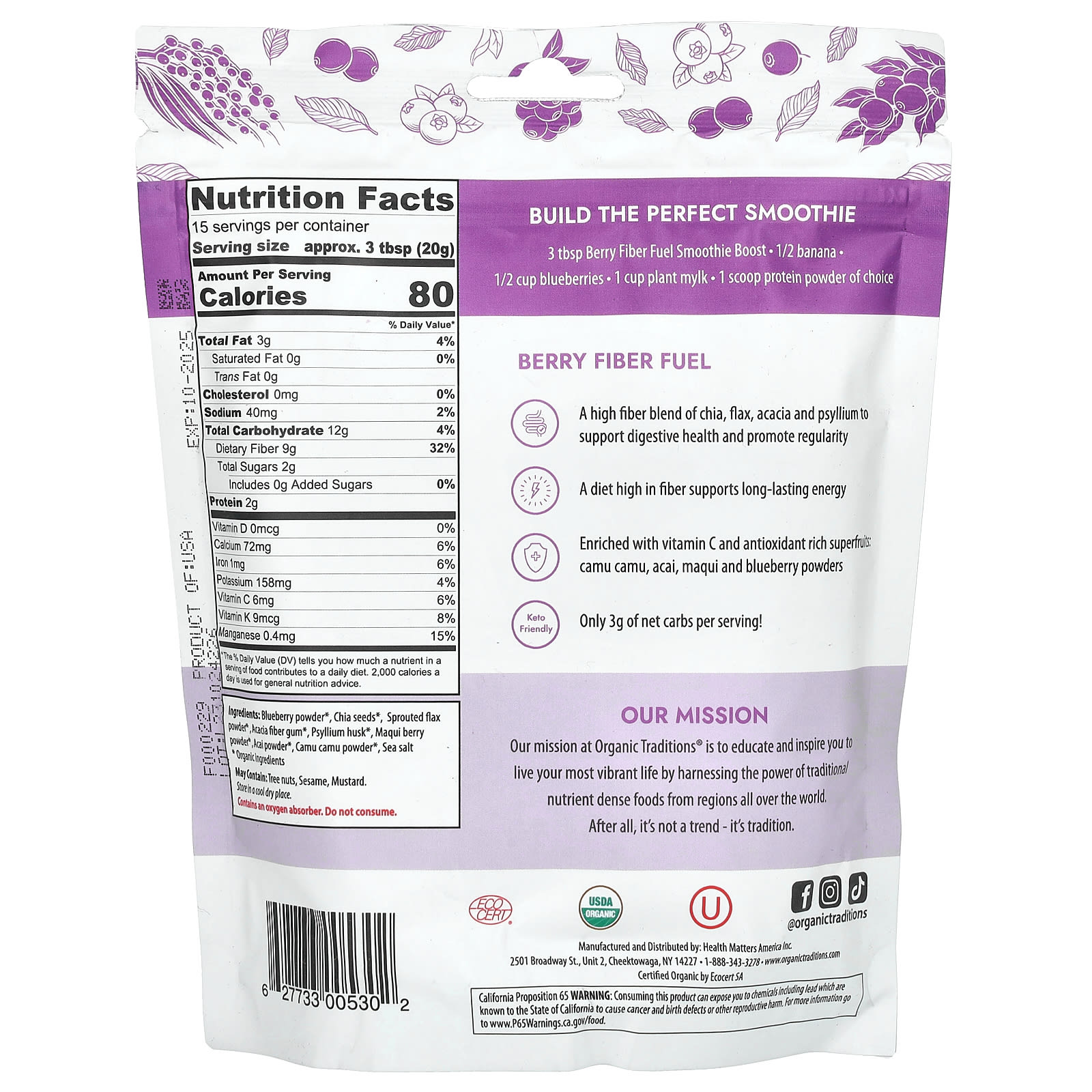Улучшите свой смузи с помощью нашего коктейля Fibre Fuel Smoothie Boost. Он сделан на основе чиа и льна (богатых омега-жирными кислотами) и обработанной пребиотиками шелухи подорожника. Доказано, что диета с высоким содержанием клетчатки обеспечивает длительную энергию, способствует регулярности и поддерживает здоровье пищеварительной системы. В состав Smoothie Boost из органических ягодных волокон входят четыре суперфрукта, богатых антиоксидантами; асаи, голубика, маки и ягоды каму-каму, которые питают вас с каждым глотком.