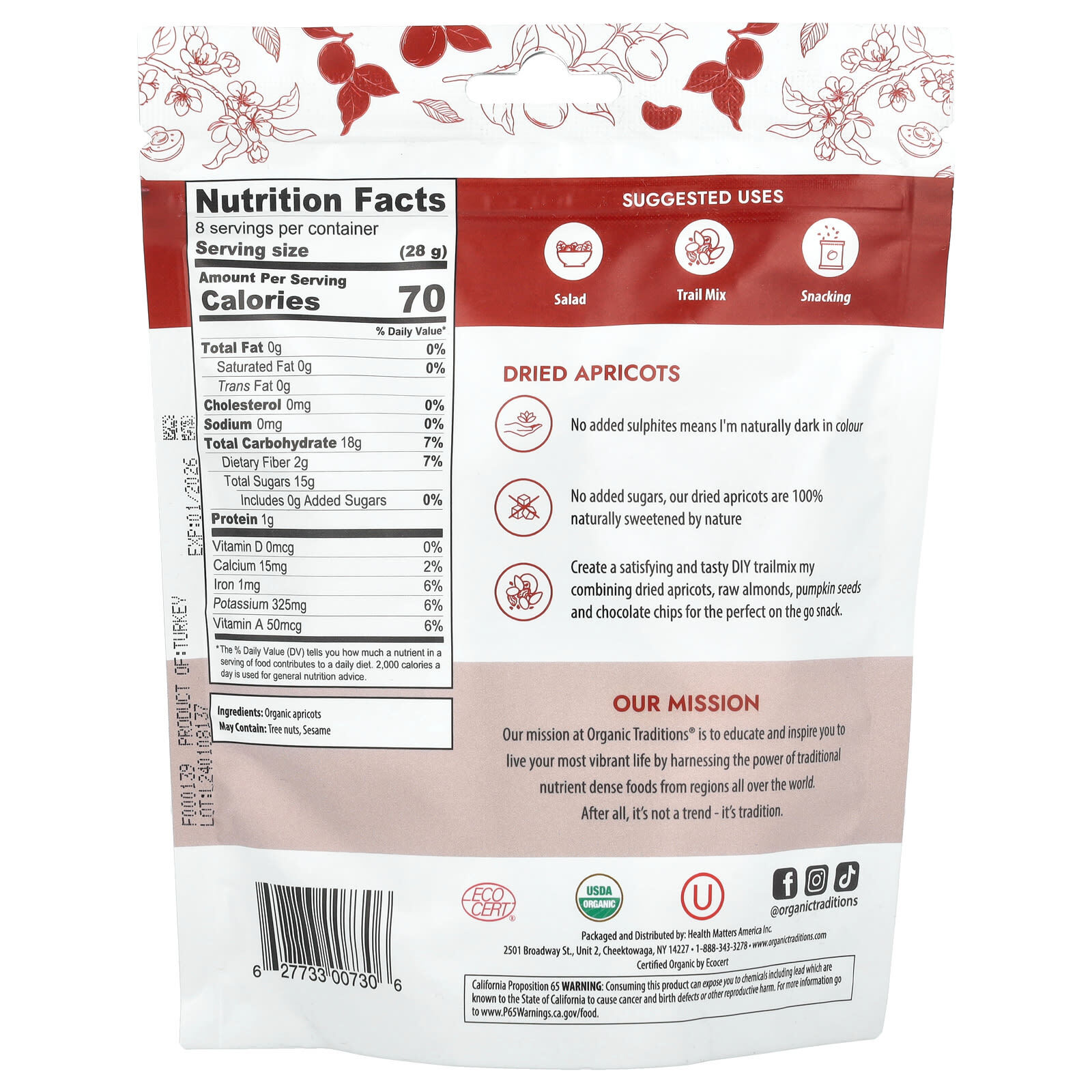Абрикосы веками употреблялись в пищу представителями традиционных культур по всему миру. Говорят, что первые выращивания абрикосов относятся к 3000 году до нашей эры. Organic Traditions предлагает лучшие органические, кошерные и несульфированные абрикосы. Они созревают в виноградной лозе, чтобы обеспечить максимальную концентрацию питательной энергии и вкуса, а затем сушатся естественным путем до мягкой, восхитительно жевательной текстуры.