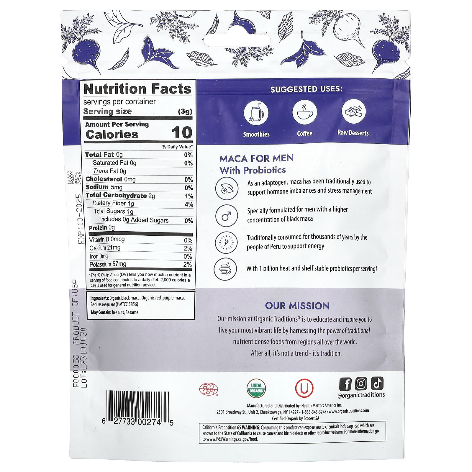 Мака для мужчин от Organic Traditions - это уникальная смесь маки, специально разработанная для мужчин. В состав корня маки входит более высокая концентрация корней мака по сравнению с корнями красно-фиолетового цвета: две части черного и одна часть красно-фиолетового цвета. Для удаления крахмала из клубня используется запатентованный процесс желатинизации. Благодаря этому достигается большая концентрация эффективных фитонутриентов. Без наполнителей, добавок, консервантов, красителей и тростникового сахара. Улучшите свой любимый рецепт смузи или добавьте в воду, кокосовую воду, сок, кофе, чай, коктейли, йогурт, хлопья, овсянку, кашу, ягоды, пудинг, яблочный соус, блины, хлеб, выпечку, салаты, супы, обертывания, перемешивание - жареные блюда, киноа, рис и паста, сырые десерты из суперфудов и многое другое!