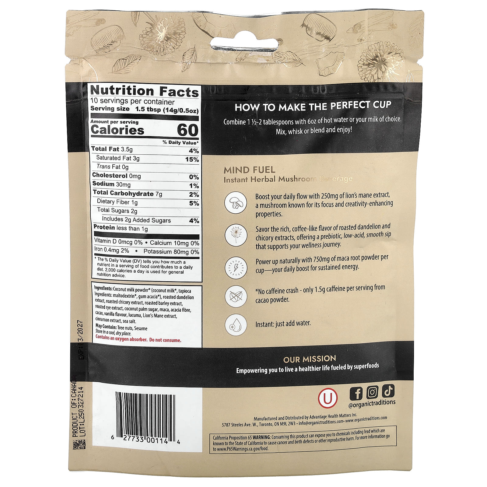 Сухое кокосовое молоко* (кокосовое молоко*, тапиока. Ингредиенты: мальтодекстрин*, аравийская камедь*), экстракты обжаренного одуванчика, экстракты обжаренного цикория, экстракт обжаренного ячменя, экстракт обжаренной ржи, кокосовый пальмовый сахар, мака, клетчатка из акации, какао, ароматизатор «Ваниль», лукума, Экстракт ежовика гребенчатого, экстракт корицы, морская соль.